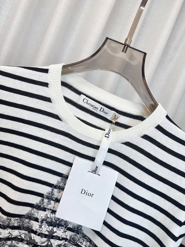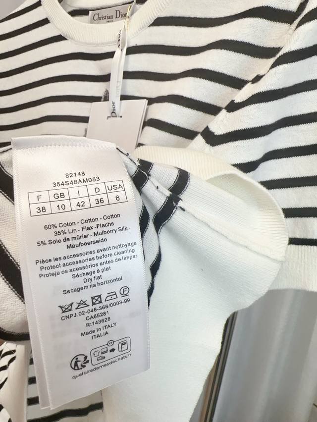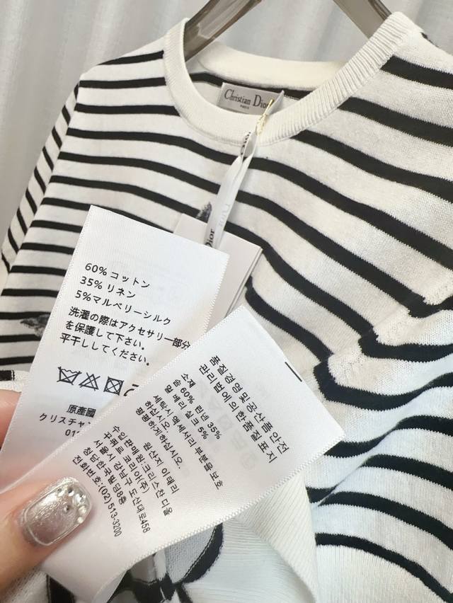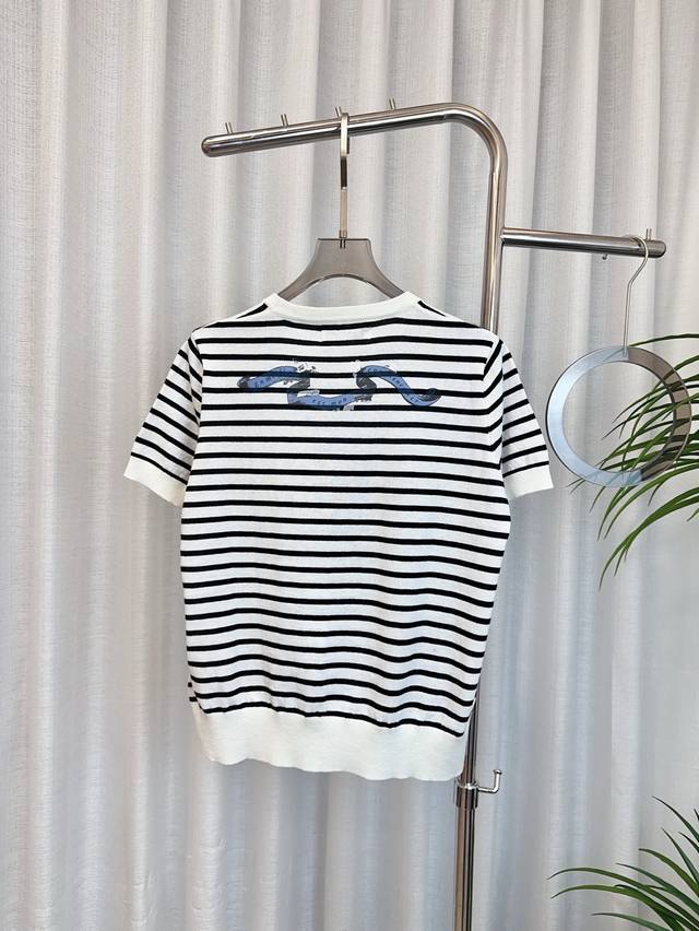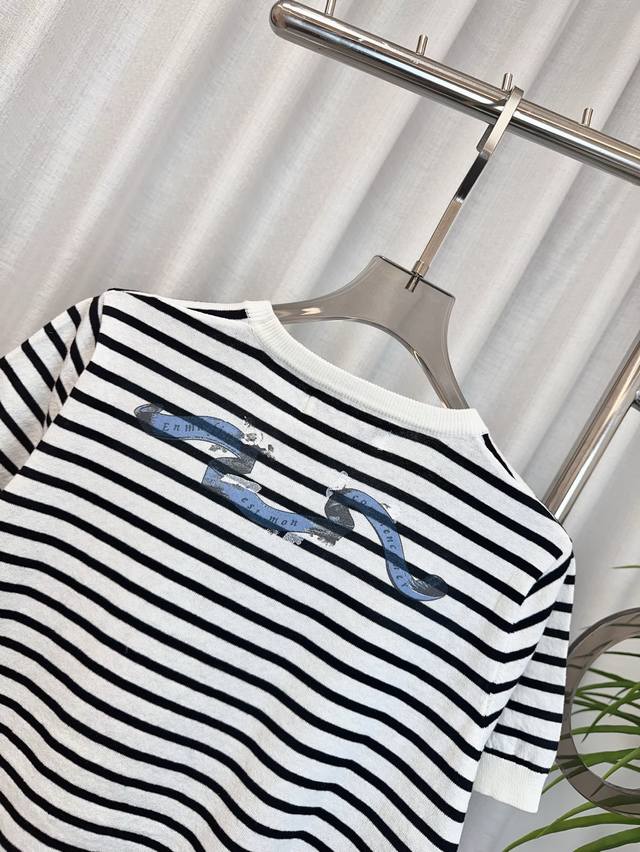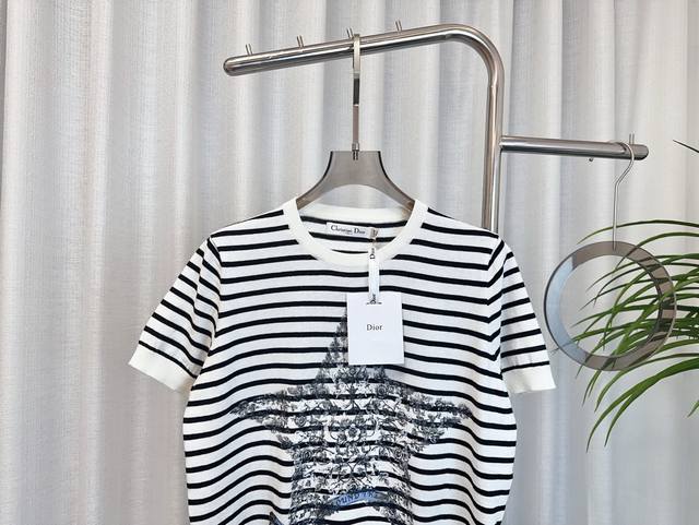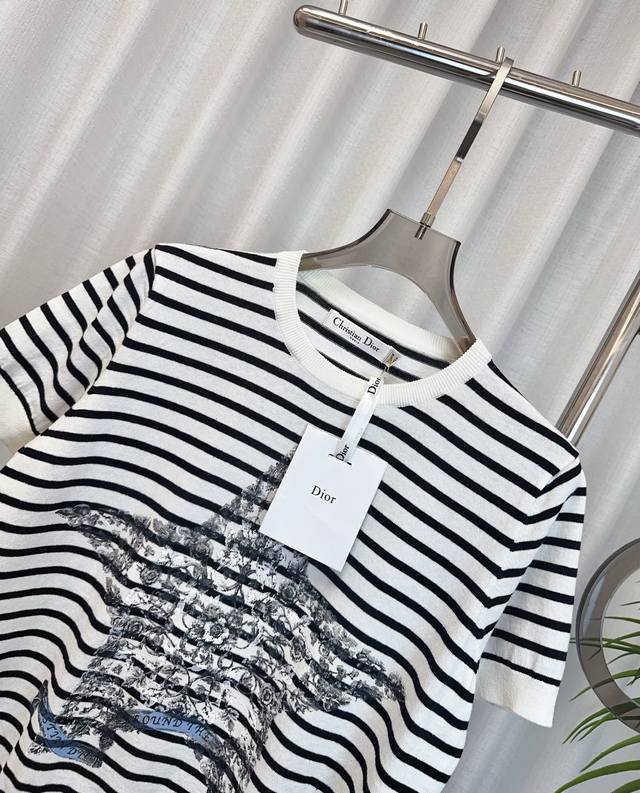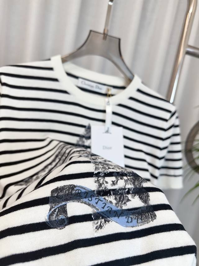 Di*R new printed five-star ribbon cotton and linen striped short-sleeved top. Cu