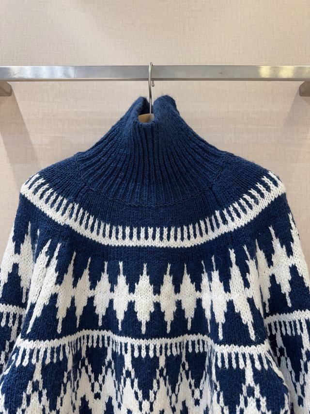 D's Fall/Winter 2025 New Arrival (DDD) features a retro Fair Isle jacquard weave, a high-neck design for enhanced warmth and style, and a relaxed, loose fit, a blend of retro and casual chic. The thick knit provides warmth during the cold winter months, easily capturing the autumn/winter vibe whether paired with trousers or a skirt. Sizes: S, M, L.