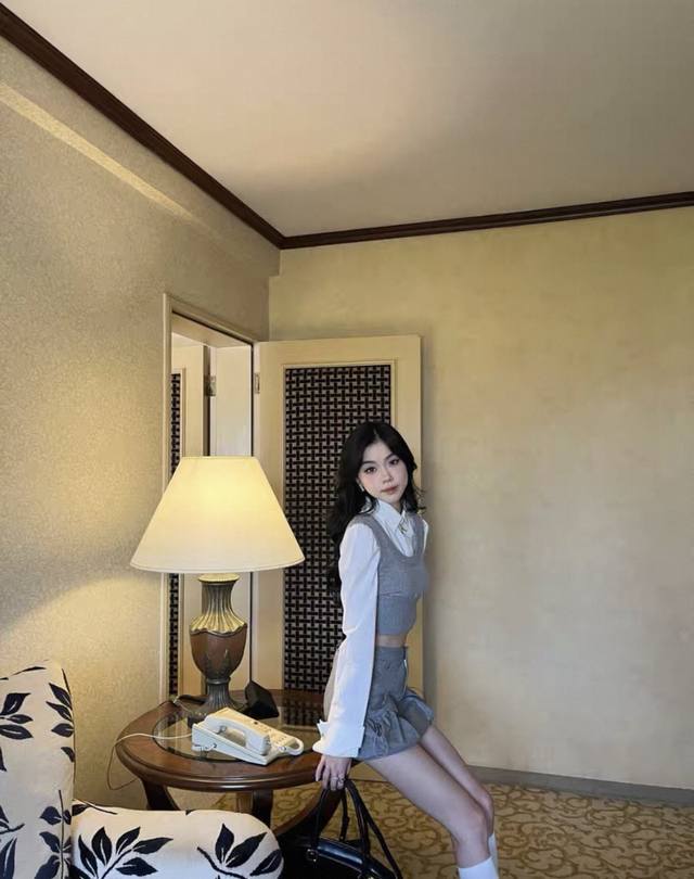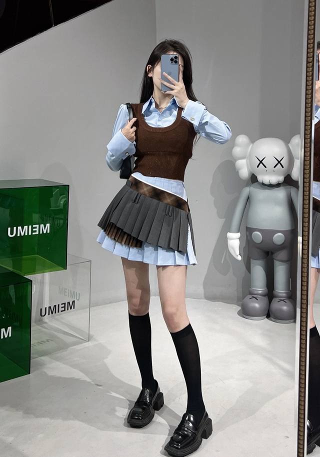 Fake two-piece contrasting knitted patchwork shirt and skirt suit
