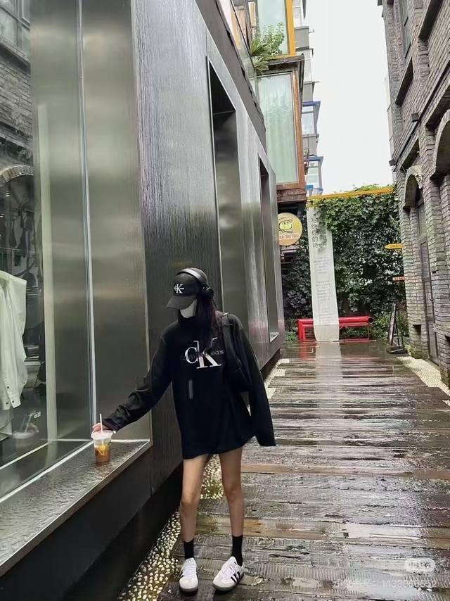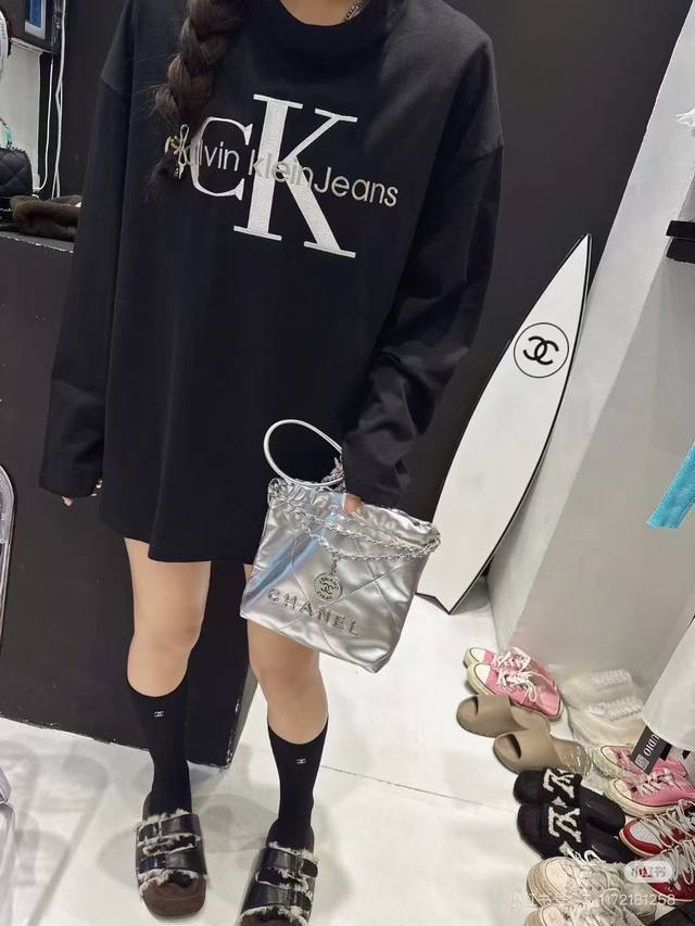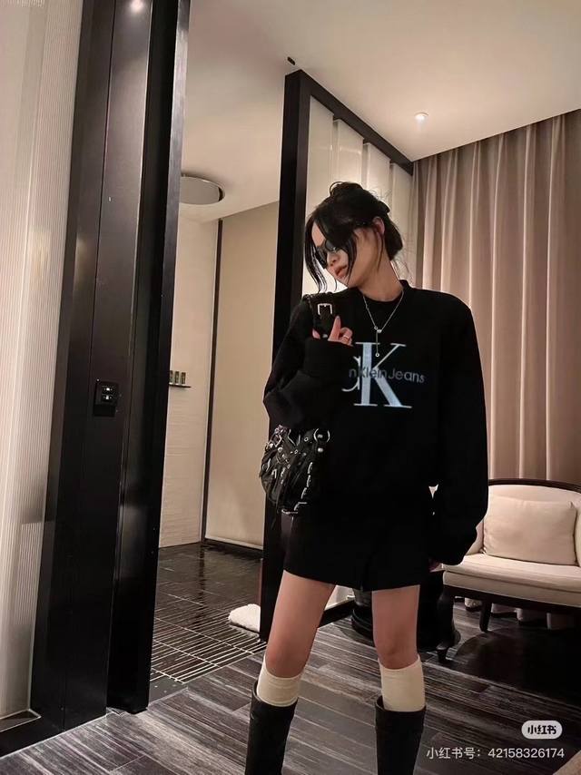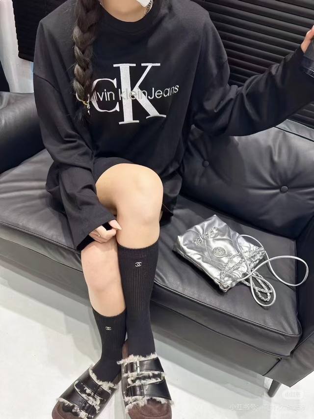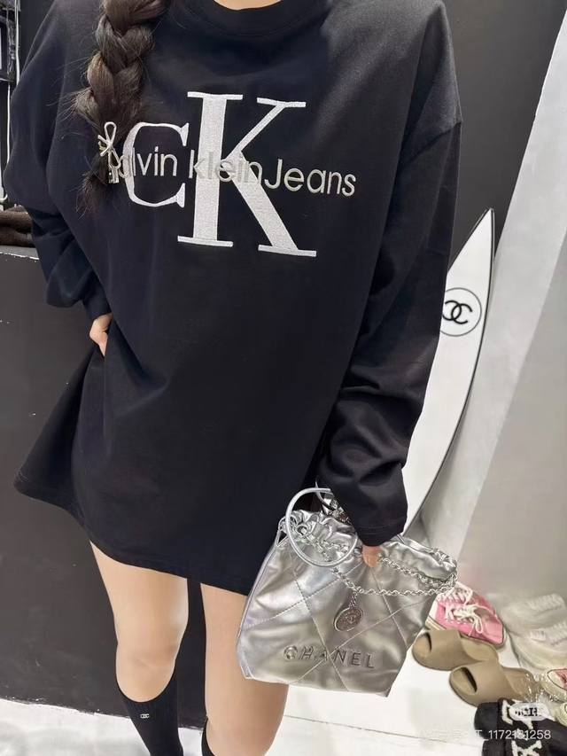 / Early autumn new European embroidery Ck long-sleeved T-shirt black and white on