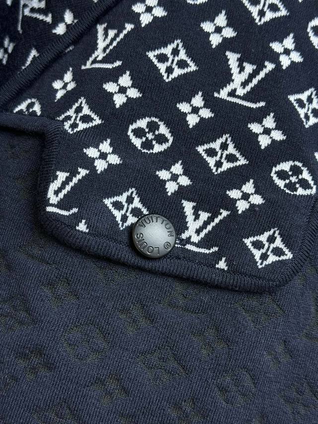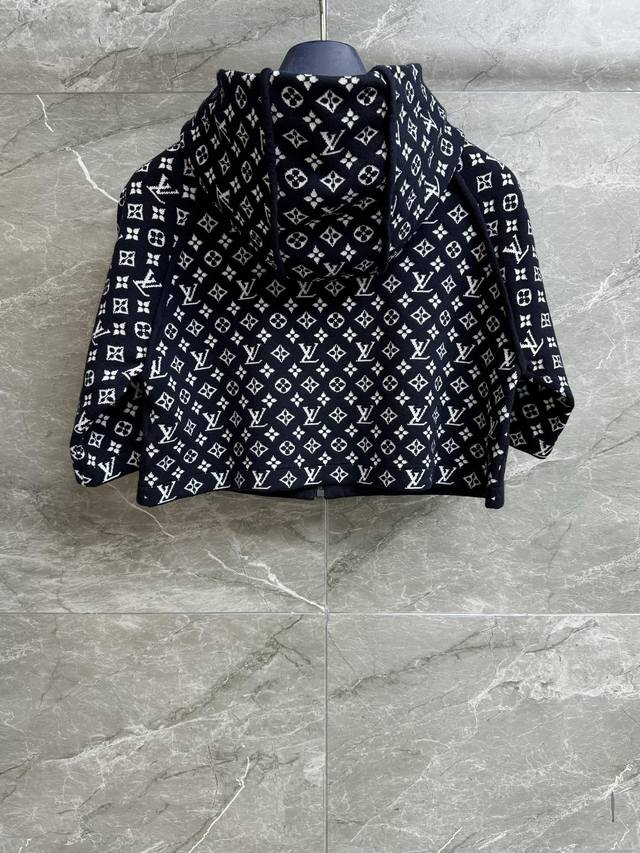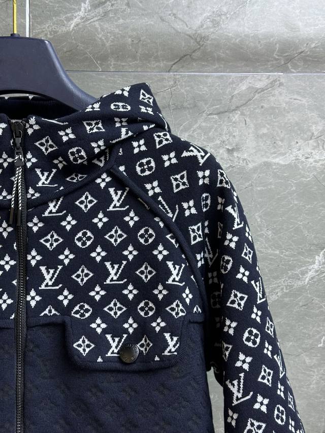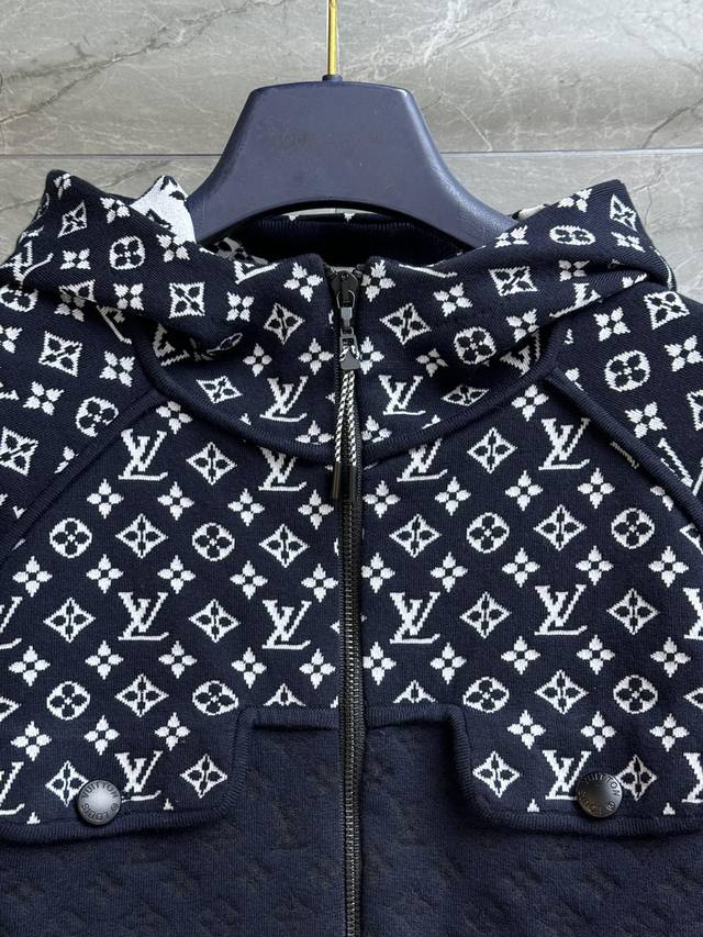 L's 2025 Early Autumn collection features a hooded zipper design, a dark blue and white monogram jacquard pattern, and two-tone stitching for a layered look. This is a stylish, high-end custom knit fabric that's comfortable and skin-friendly. The short design makes the upper body look slim and stylish. Available in full size (S, ml,