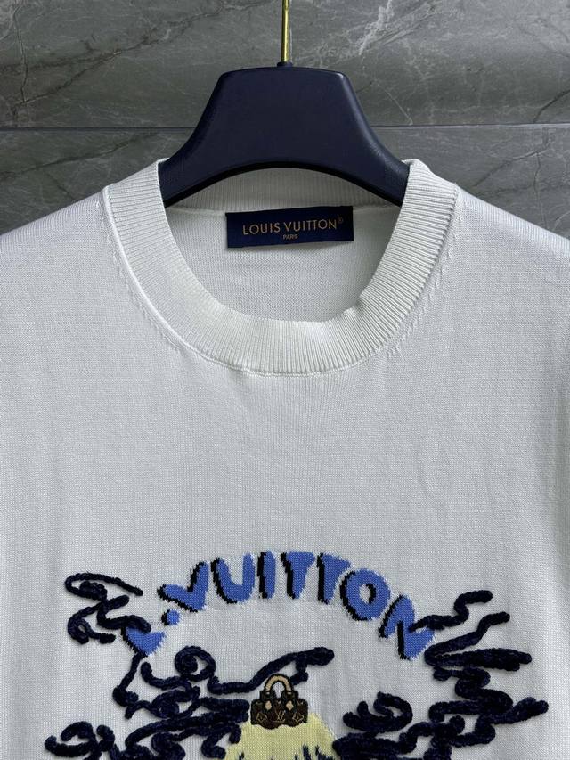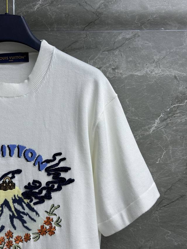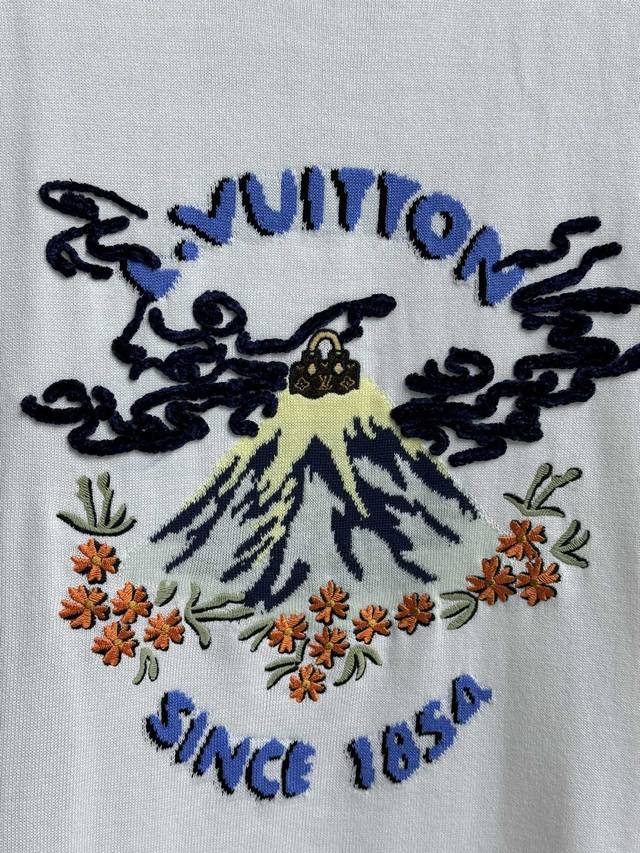 L's Volcano Embroidered Short Sleeve 2025 Fall/Winter Collection. Round neckline, ribbed neckline, volcano lettering, and cherry blossoms are combined through intarsia and embroidery to create a colorful pattern. Fashionable and youthful. Cotton knit fabric is soft, comfortable, and textured. Loose fit for both men and women. Same branding available. Available in sizes Xssml and
