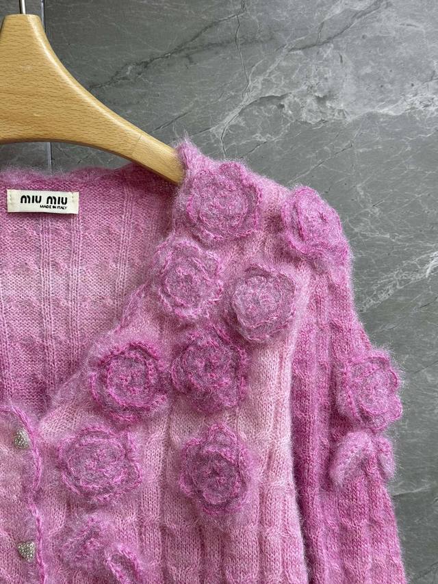 Miu 3D Flower Cardigan 2025 Early Fall Collection. Elegant V-neck collar, embellished with hand-crocheted 3D flowers. Sweet, youthful color scheme. Wool blend knit fabric is soft and comfortable. Short style gives you a slim and elegant look. Available in full sizes Sml