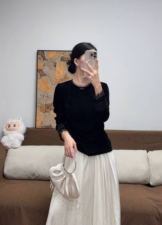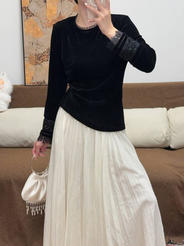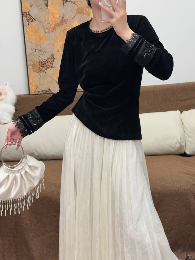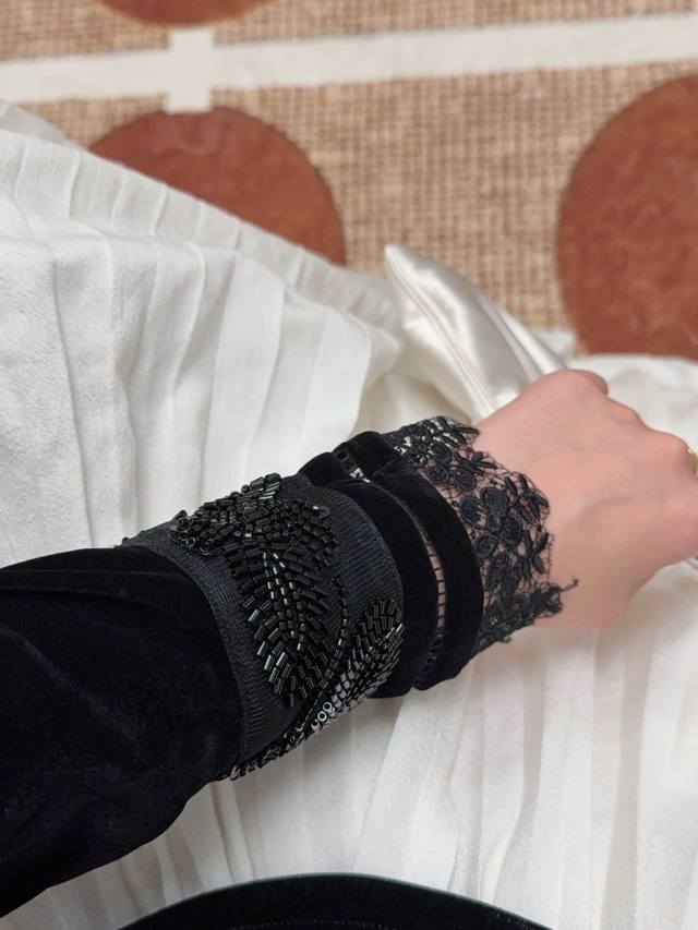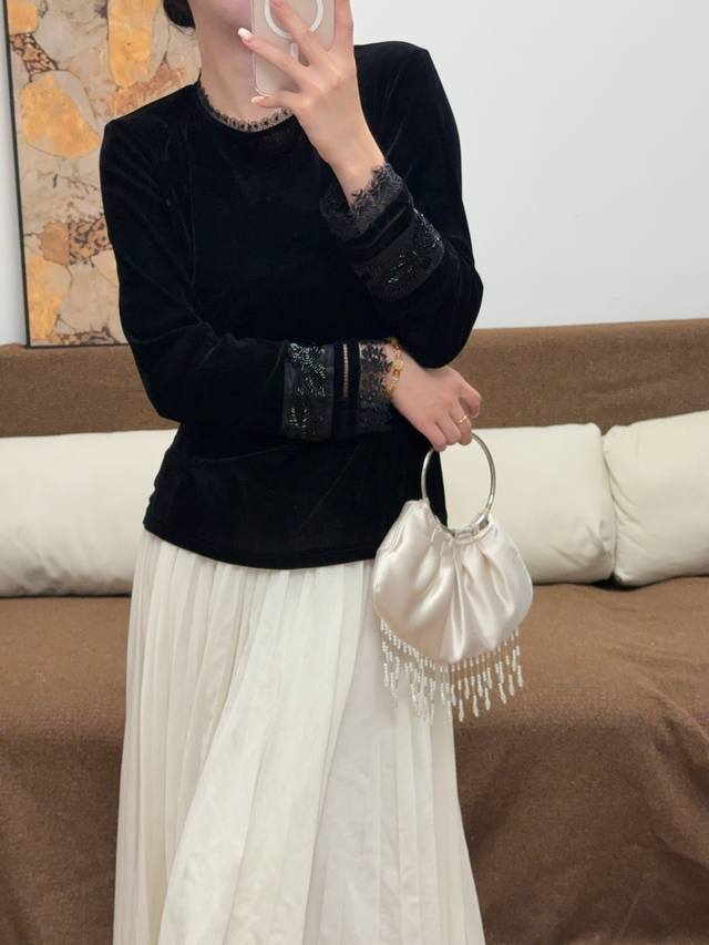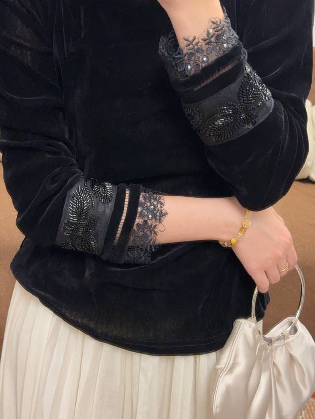 Classic elegant black slim and stylish, velvet fabric skin-friendly and full of stretch, cuffs and neckline exquisite embroidery lace embellishment, high-end sense burstingSmlxl