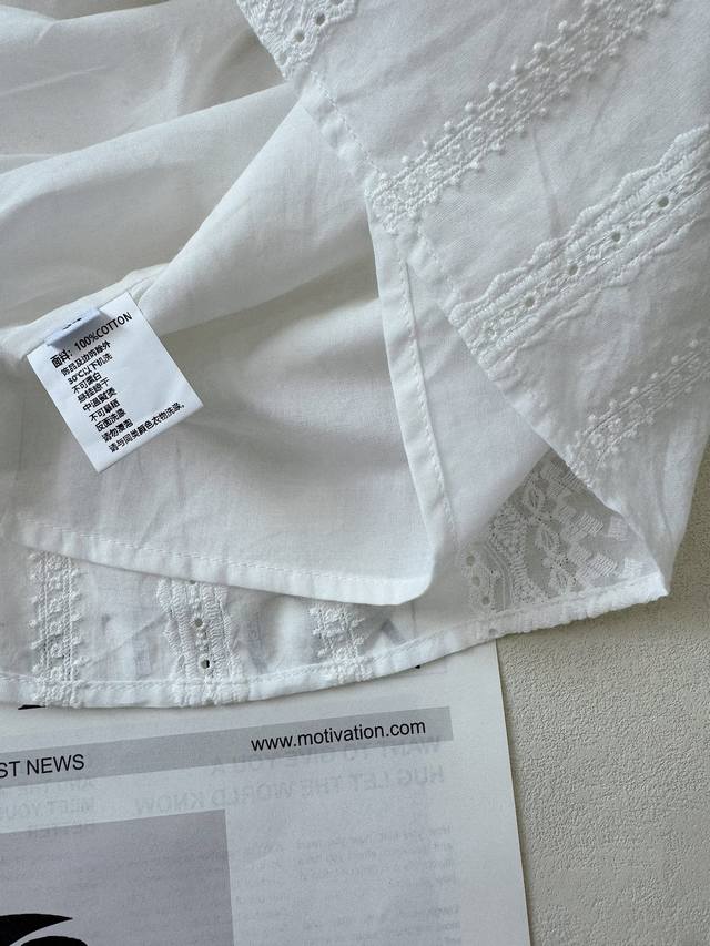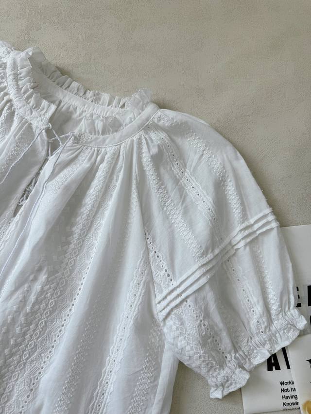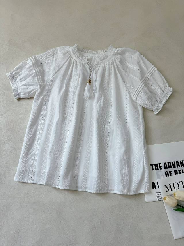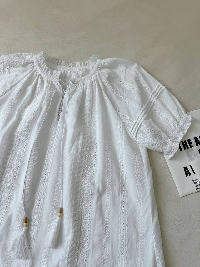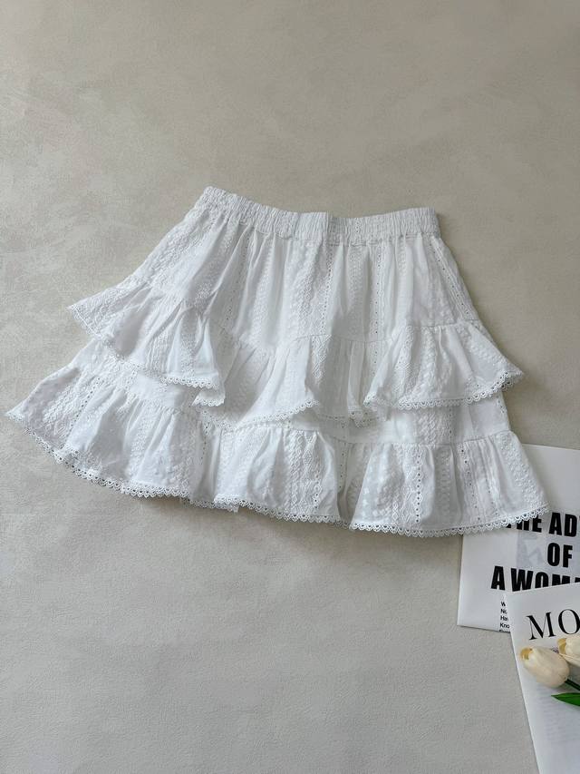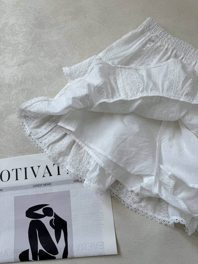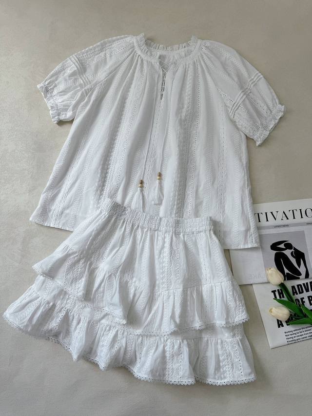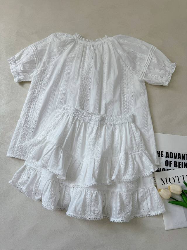 : A lace short-sleeved top with tassel lace-up design and a layered culottes set with lace hem. Heavyweight custom-woven artistic embroidery texture, pure cotton material, refreshing and breathable. Tucker pleats on the sleeves perfectly shape the curves of the arms. A vibrant elastic waist skirt with double-layer pleating and splicing of three-dimensional hollow lace. The artistic beauty and practical aesthetics overlap to create a lively girlish look. 34.36.38 Top and Skirt