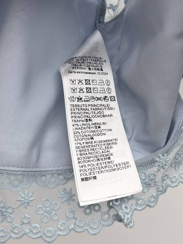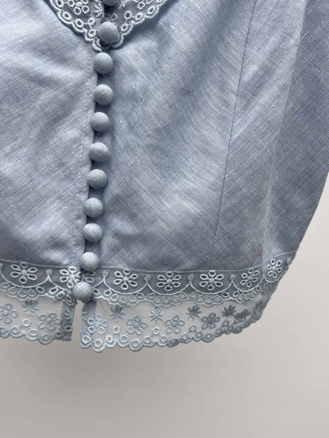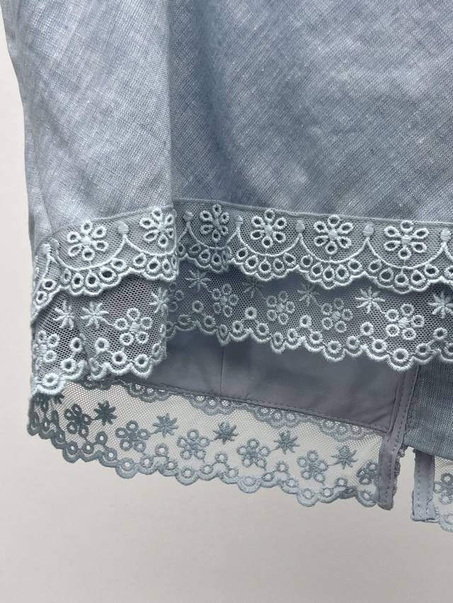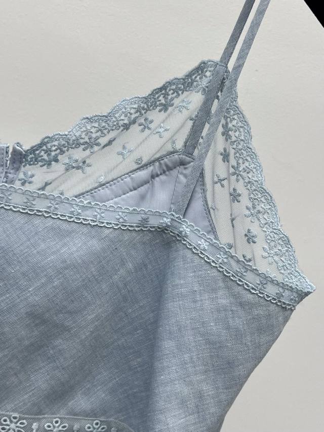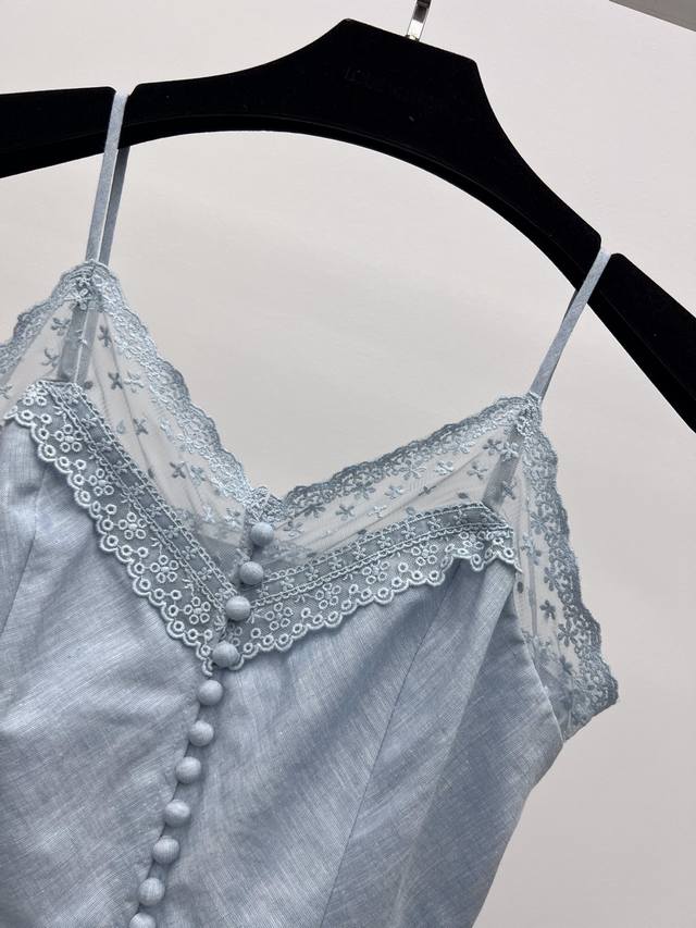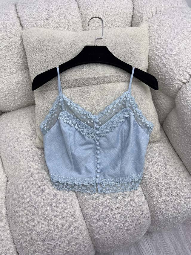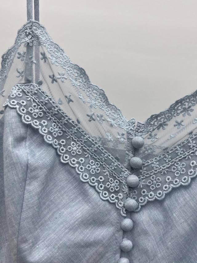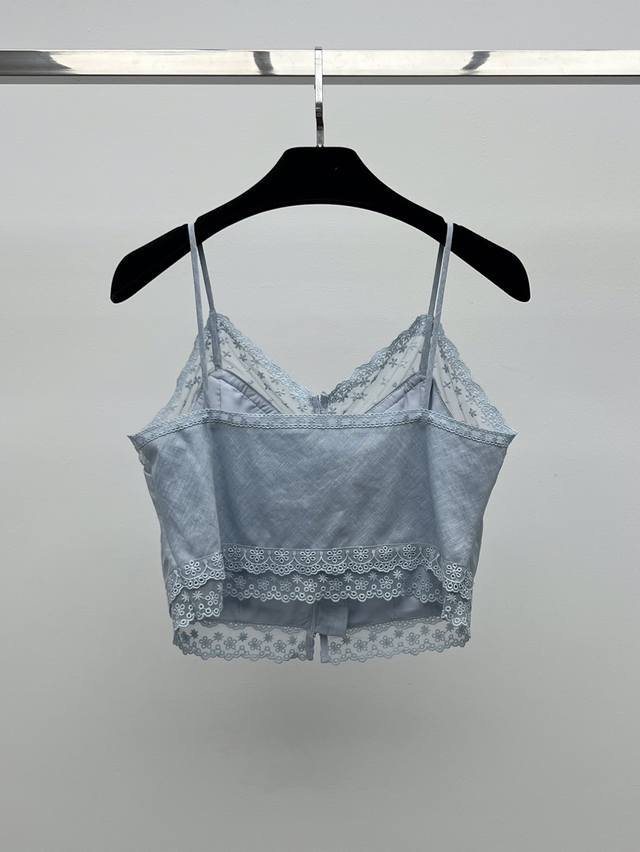 A short camisole with thin straps and a V-neck. Made from linen fabric with lace stitching.