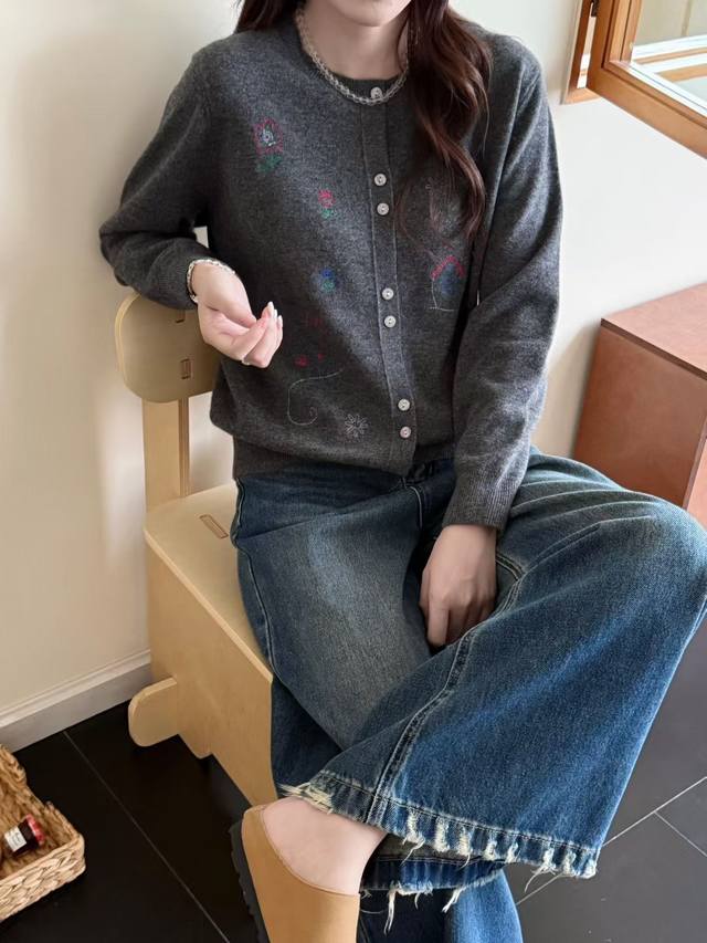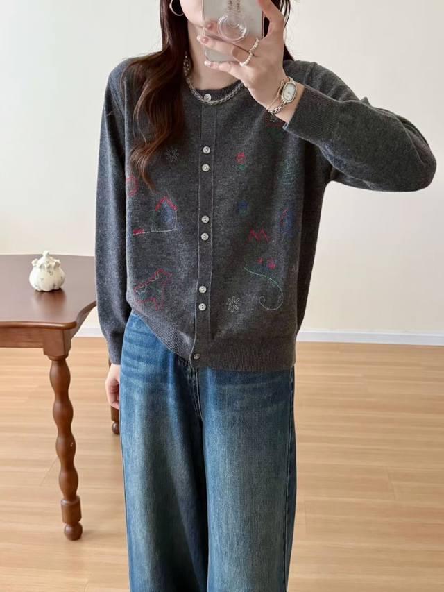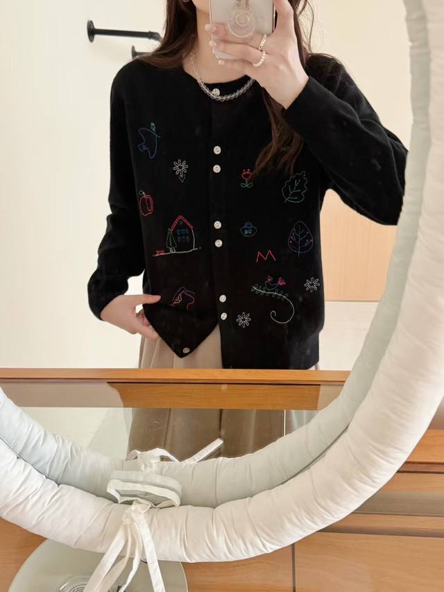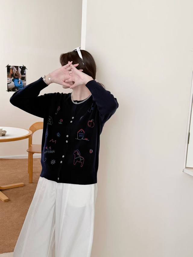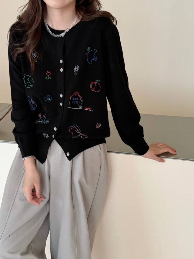 European Station 2025 Early Autumn New Women's Round Neck Cartoon Embroidery Colorblock Wool Long Sleeve Cardigan European Goods Knitted