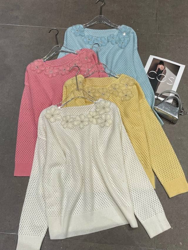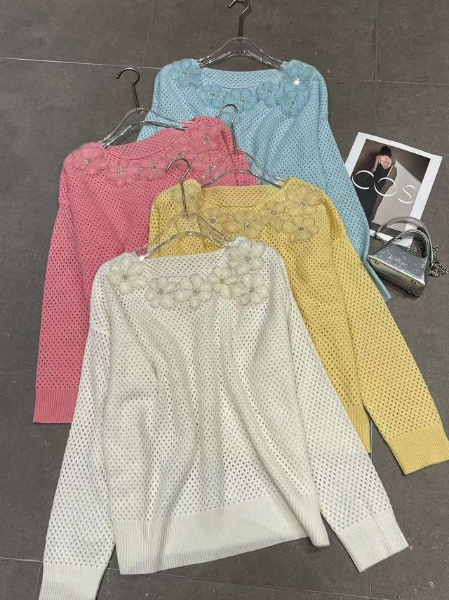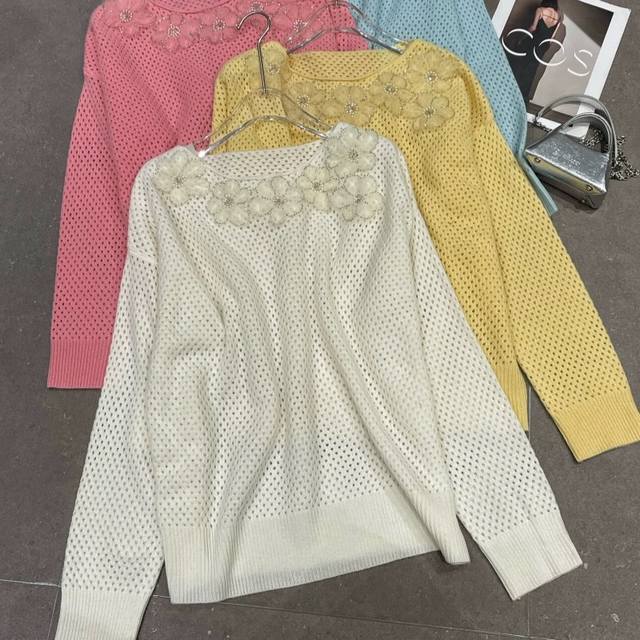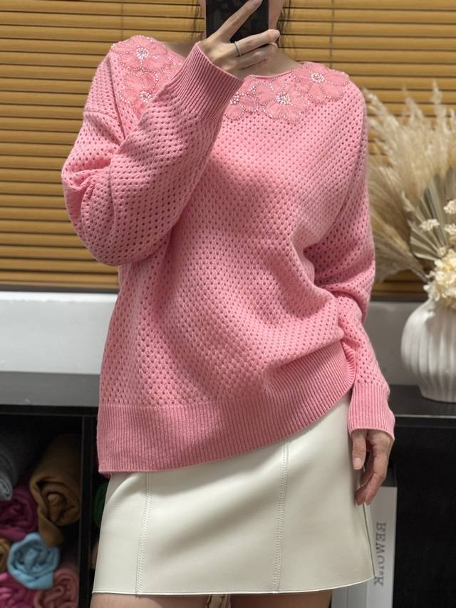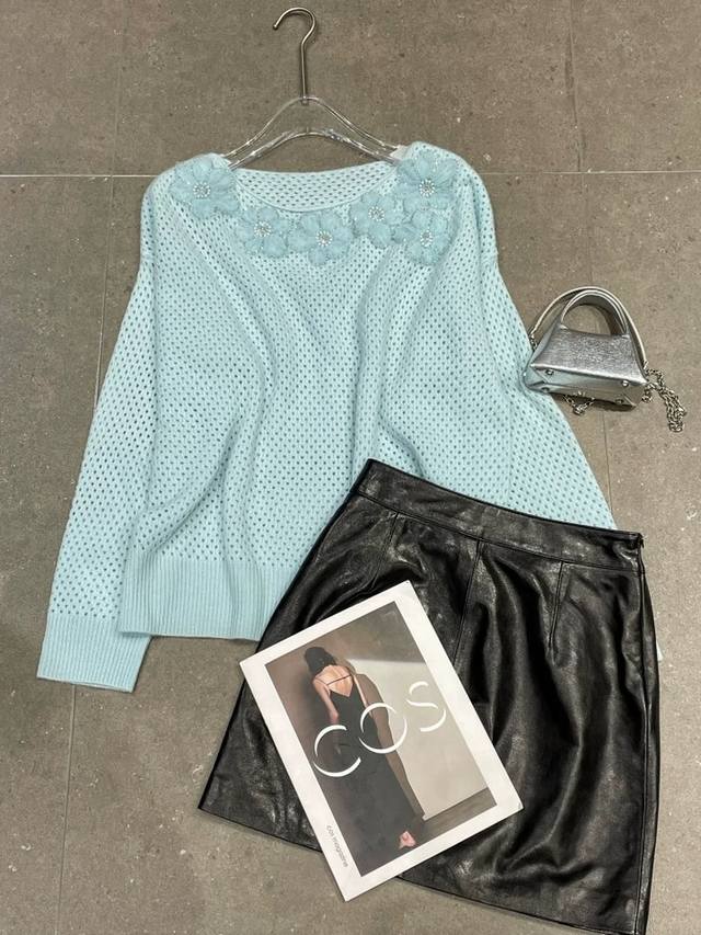 European station flower beaded hollow long-sleeved wool sweater top women's loose slim fashionable sweater 2025 autumn