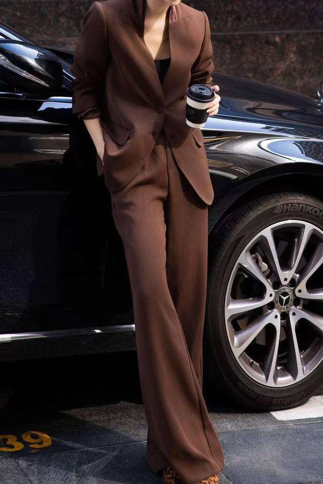 Exclusive best-selling acetate jacket and wide-leg pants set, retro Maillard color scheme, combining practicality and beauty, exuding confidence, suitable for various occasions and styles, showcasing a confident and elegant image. Coffee color, plum purple, Smlxl,