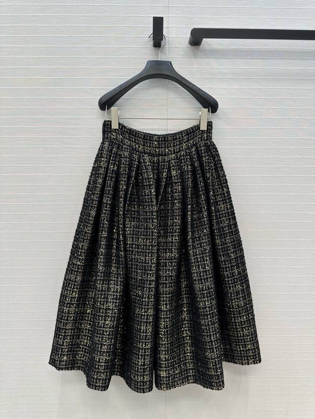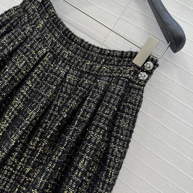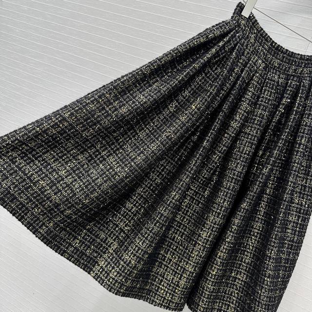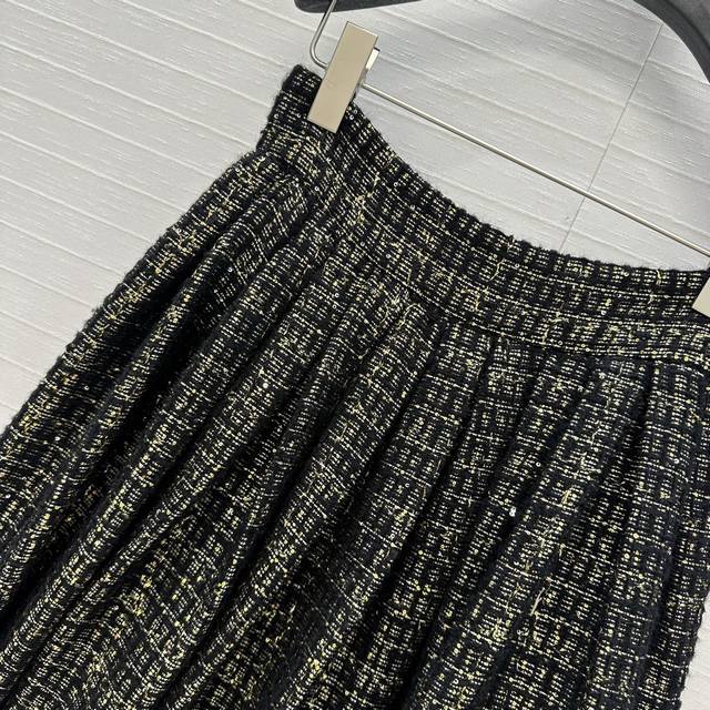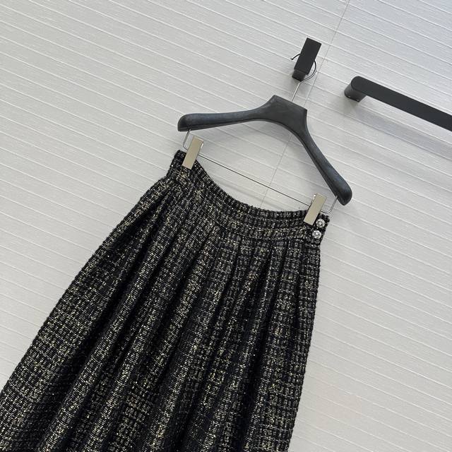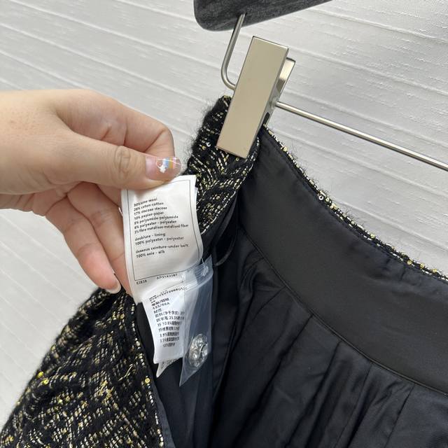 Exclusive first release, high-end, original quality! A must-have for all-female beauties! A retro, palace-style, pleated maxi skirt! Made from premium black and gold sequined soft tweed fabric from the 25A Handicraft Collection, this is a stunning piece! A must-have for all-female beauties with French elegance! The 3D-cut, pleated silhouette creates a flattering effect. Crystal metal buckles and impeccable craftsmanship are evident in the details. In stock, all 3 sizes in one color. Large orders welcome! Size 36, waist 68cm, length 77cm.