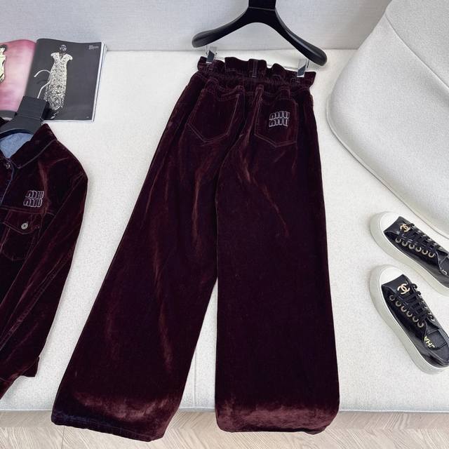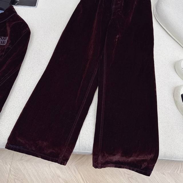Exclusive First Release: Miu 25Ss Early Autumn Newest Velvet Set - Drop-Shoulder Jacket and Pants. This year's newest trend: a sophisticated and stylish look! The top is both cool and chic, featuring logo and letter patches and embroidery. Made of custom velvet fabric with a three-dimensional cut, it's versatile and flattering for everyone. Available in separate colors, sizes S, M, and L. Size S: Jacket shoulder width 47cm, bust 57cm, length 57cm, pants waist 72cm, hip circumference 72cm, pants length. Measurements may vary slightly due to manual measurement.