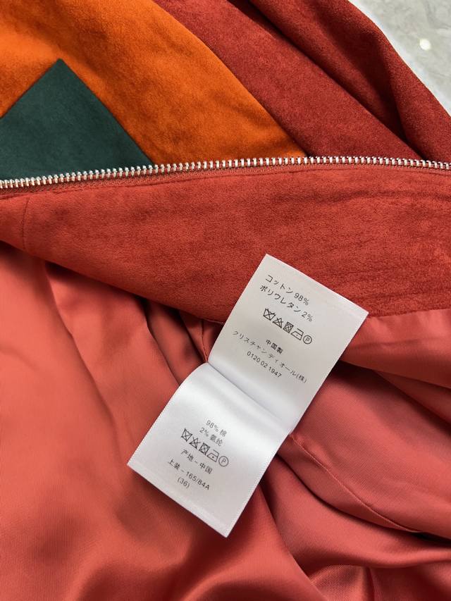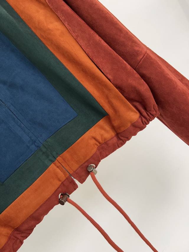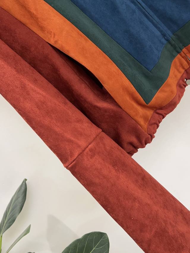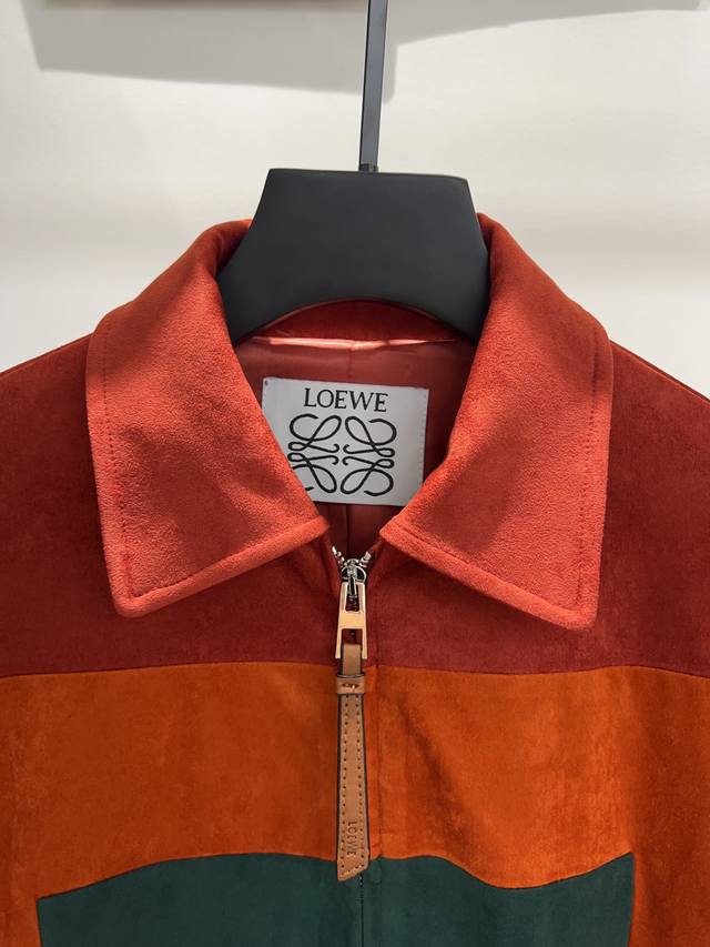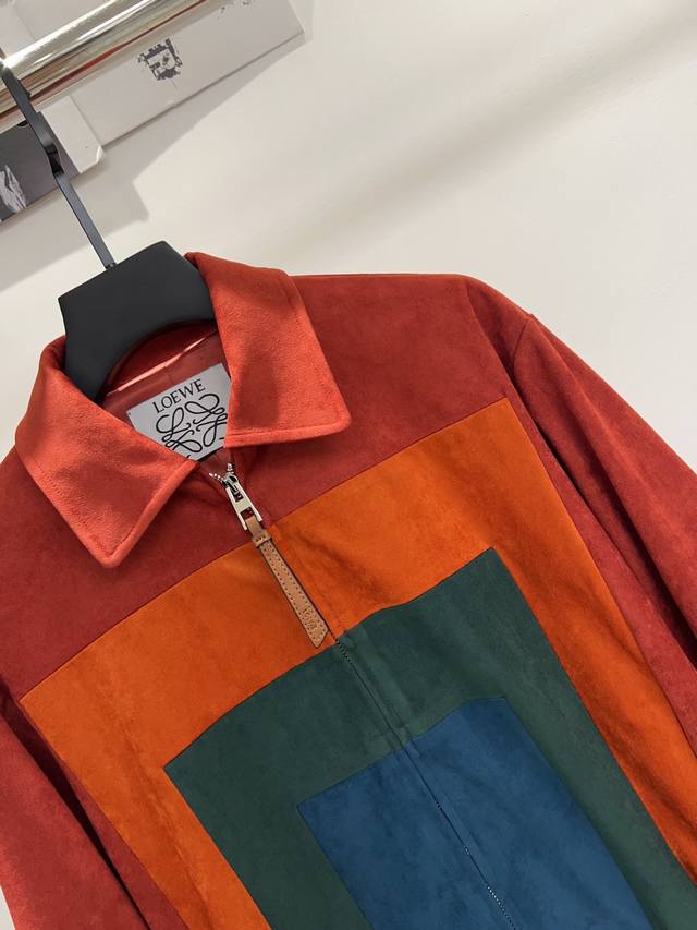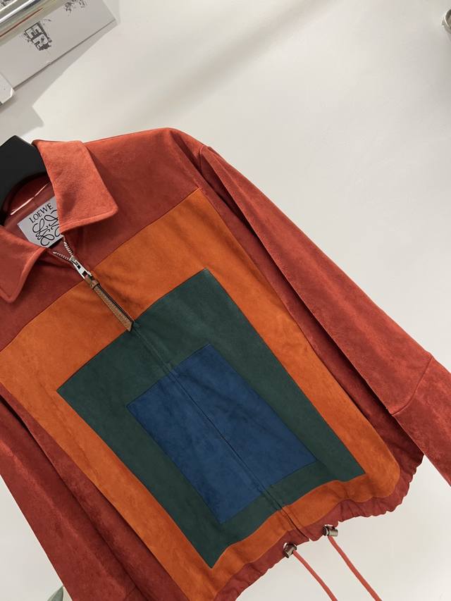 Loe*E 25 Autumn/Winter New Color-Blocked Cowhide Suede Jacket! The silky suede leather is predominantly deep red, accented with orange, green, and blue, exuding an artistic feel. Features a metal zipper and drawstring waist, combining retro style with practicality. A must-have for fashionistas looking to effortlessly create a sophisticated autumn/winter look! (Sizes in Sml)