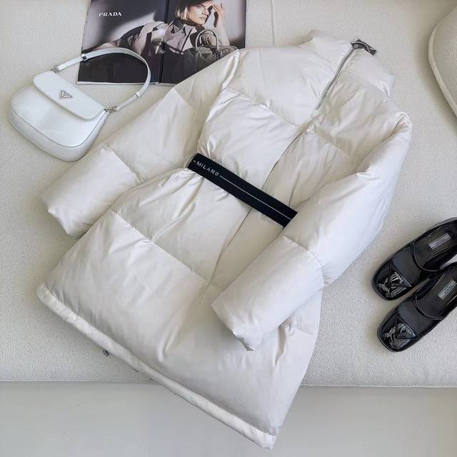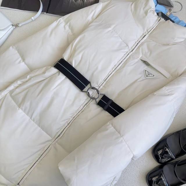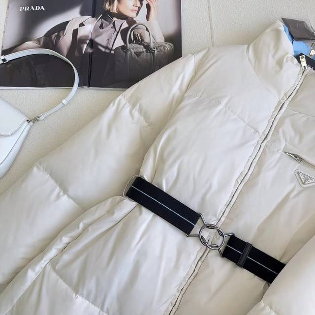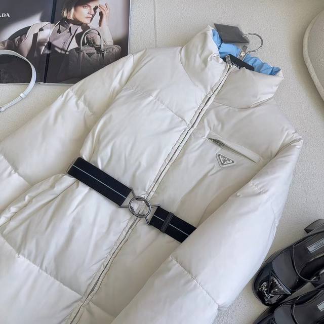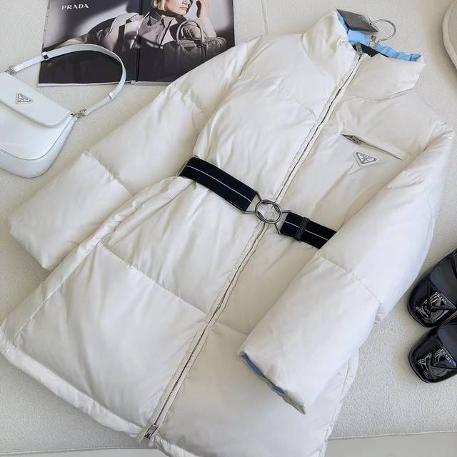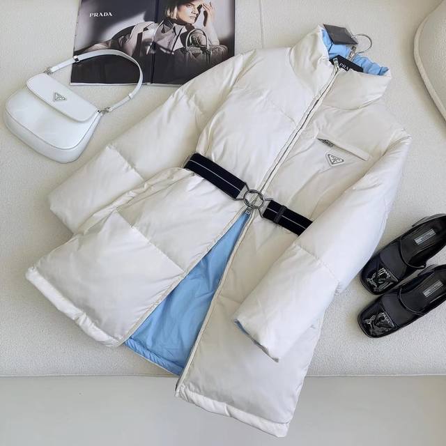 Exclusive first-run original quality Pd 25Ss autumn and winter new product, stand-up collar belt, mid-length bread down jacket, included belt, three-dimensional tailoring, H-shaped shape, classic, fashionable and handsome, original logo, letter logo, triangle logo decoration, national standard 90 white duck down filling, custom blue lining, color matching, age-reducing effect, Yb hardware accessories details are very plus points, recommended, three colors are available for sale in stock 38, 40, 42, 44. Size S: shoulder width 45, chest length 79, manual measurement, there may be errors