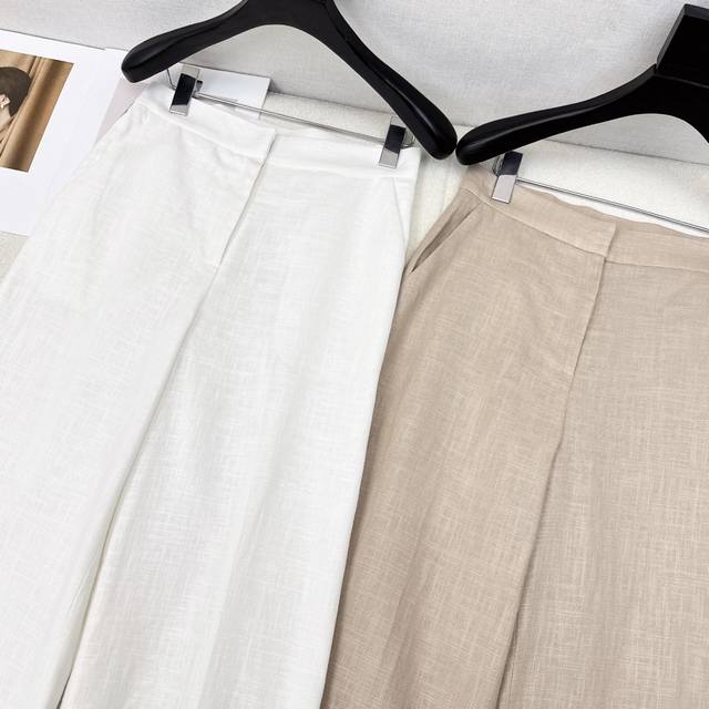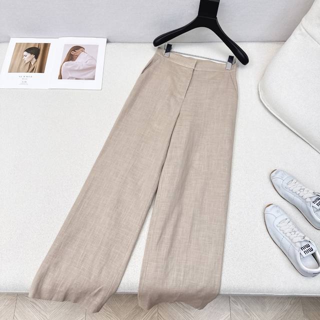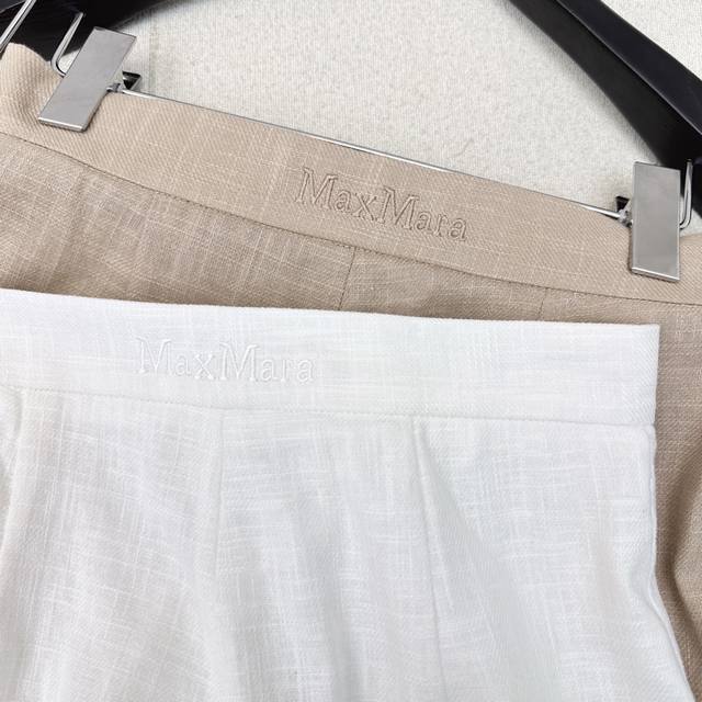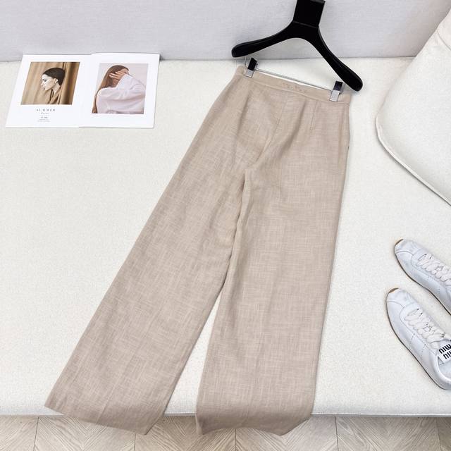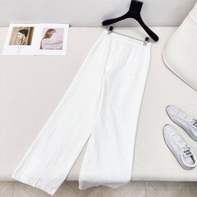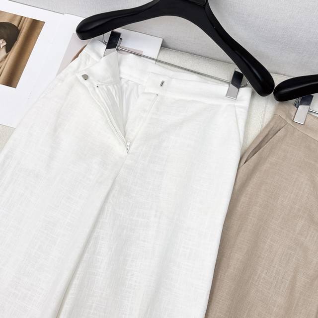 Exclusive launch of the Max 25Ss, the latest linen minimalist high-waist straight-leg pants for early fall. High-density linen fabric creates a structured, relaxed, and effortless look. A classic mid-rise straight-leg wide-leg silhouette, perfect for pear-shaped figures. Embroidered logo detailing on the back creates a subtle, understated luxury. Highly recommended for your own versatile wardrobe! The 3D silhouette offers a retro and elegant look. Imported linen fabric offers exceptional quality. Available now in one color. Size Sml: Waist 68, Hips 90, Length 102.