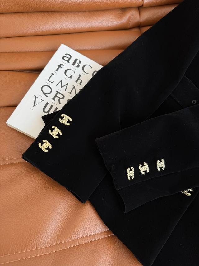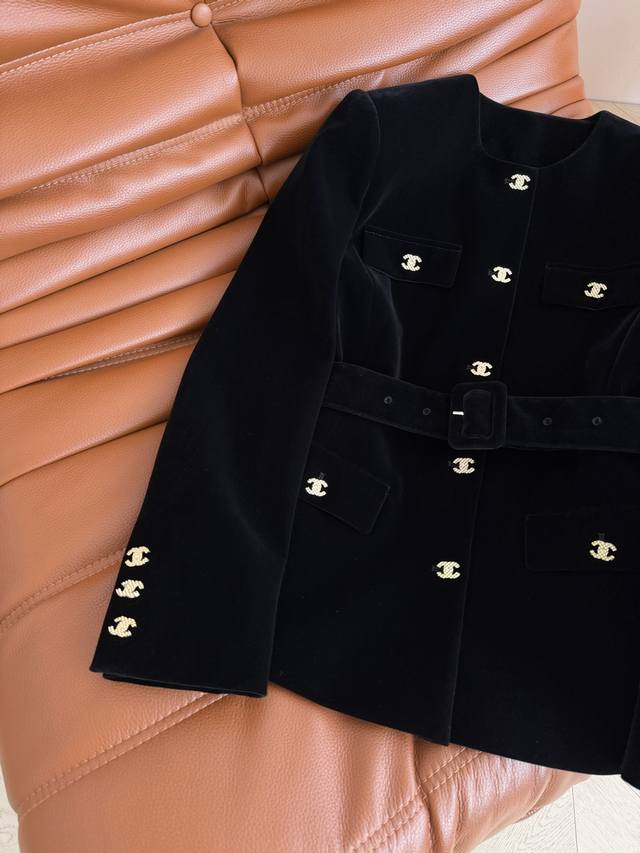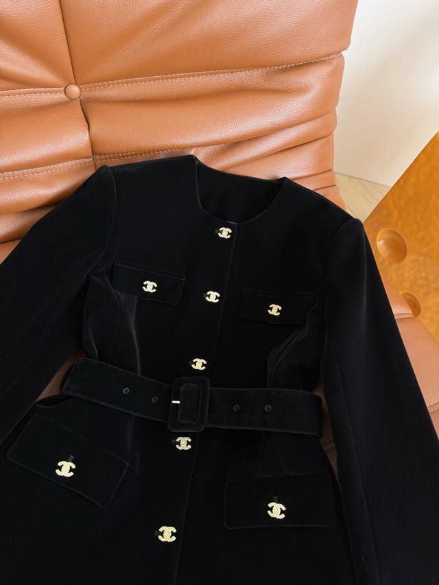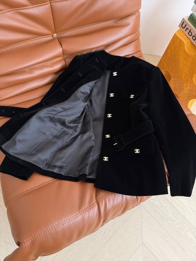 Exquisite Autumn/Winter 2025 New Double C Button Decorated velvet Coat. This coat is suitable for everyday wear or commuting. It exudes a sophisticated and high-end feel. The small round neck design and belted waist easily create a slimming effect. The all-black color is particularly slimming. Highly recommended! Available in one color and three sizes. (