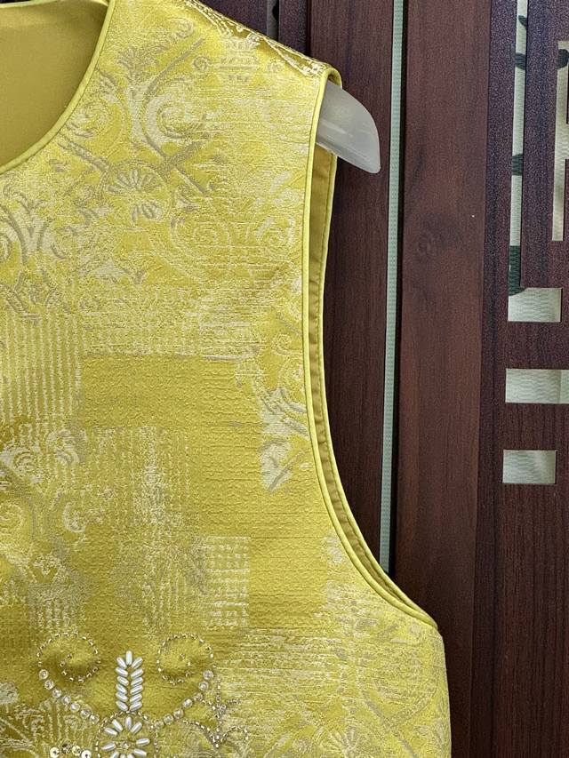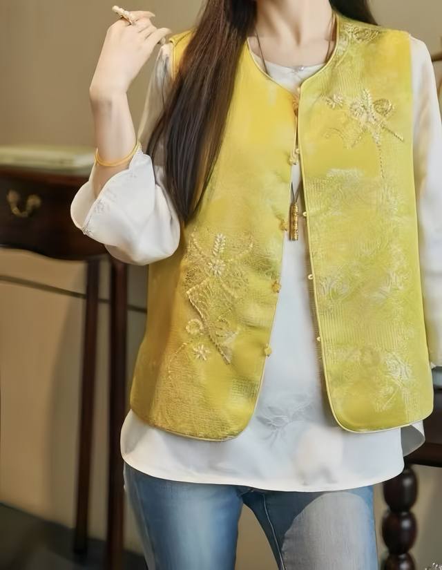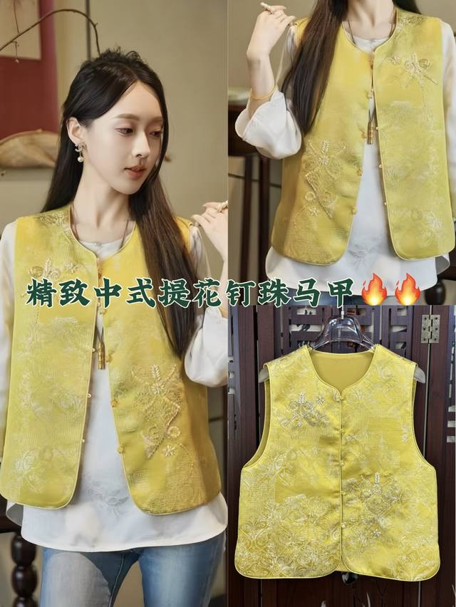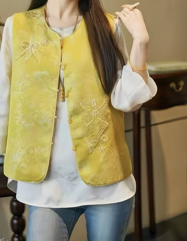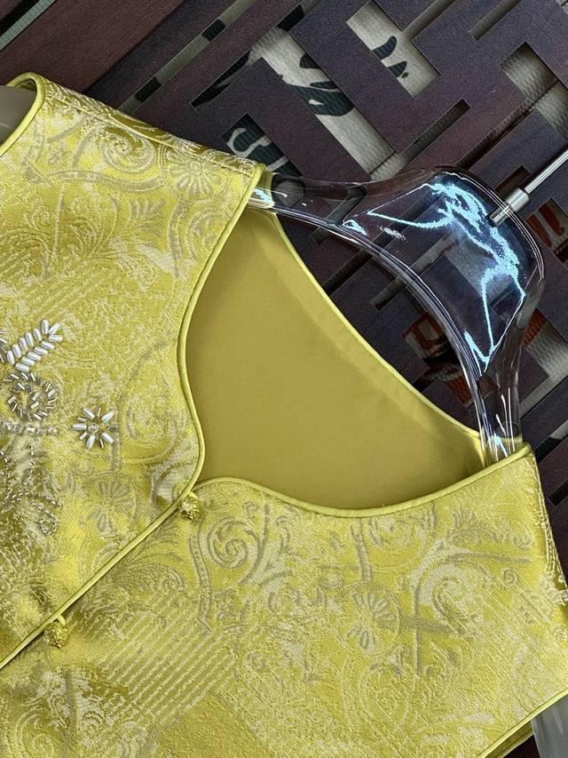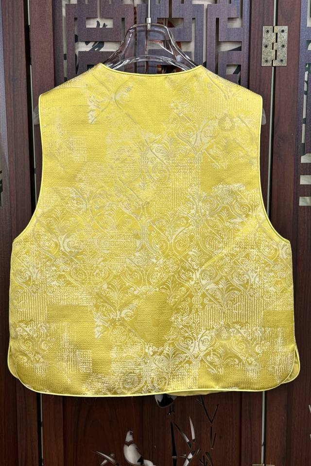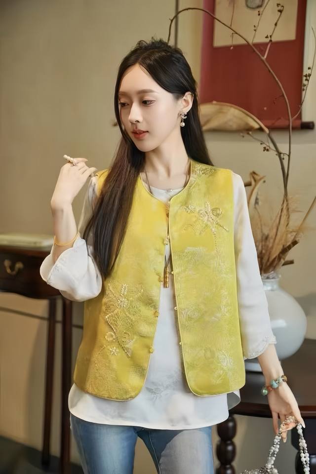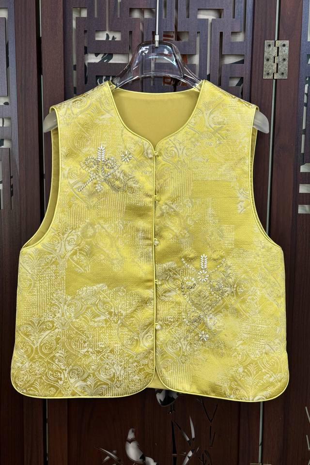 Exquisite Chinese jacquard beaded vest with a collarless design. Simple and ele