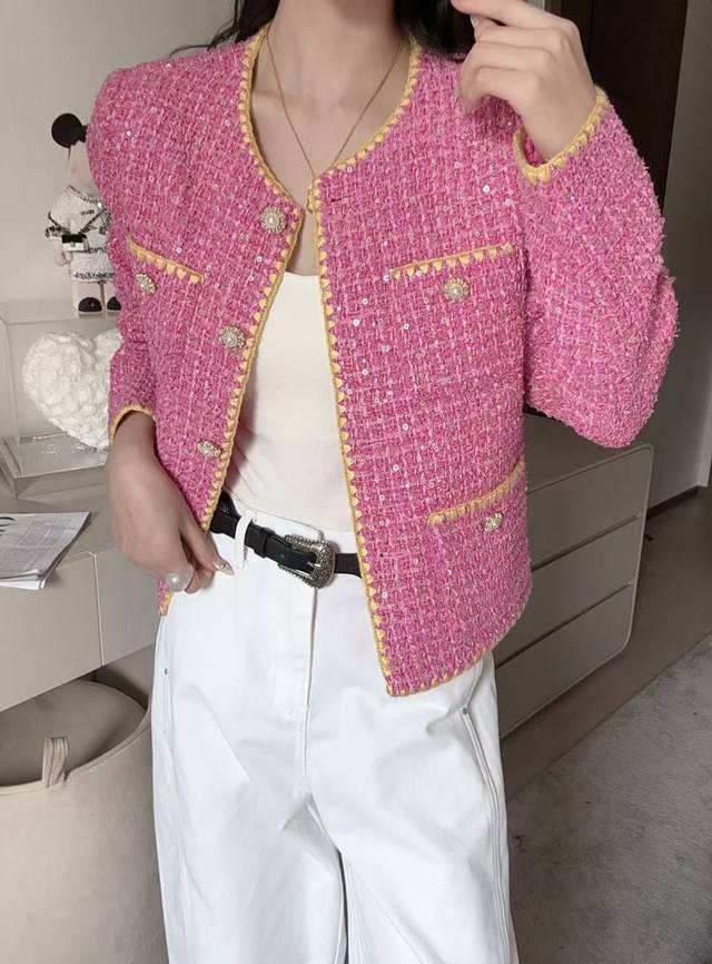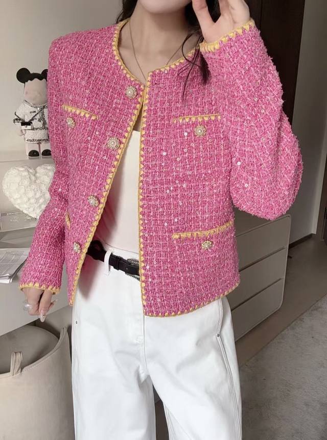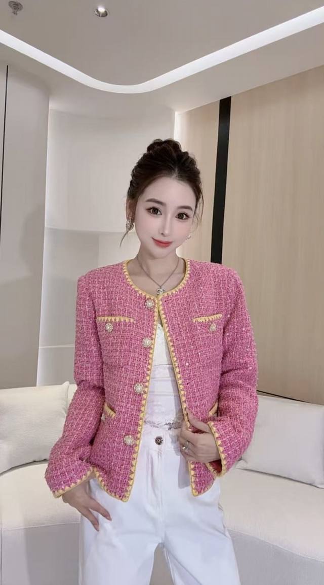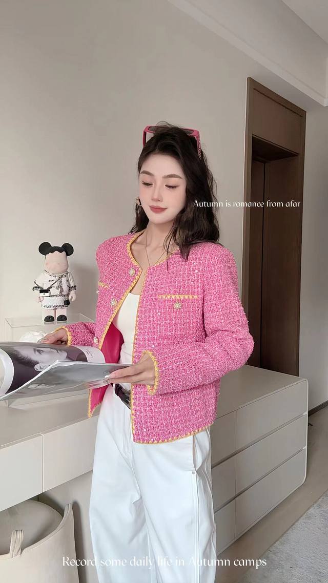 Exquisite luxury and beautiful Chanel jacket, soft pink tone with a gentle filter, exquisite and high-end texture, gold trim and button embellishment to enhance the sense of luxury, round neck design to make the neck look slender. Smlxl