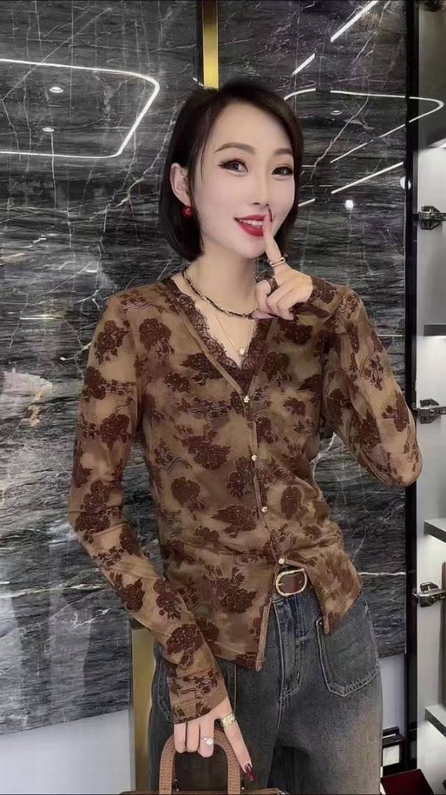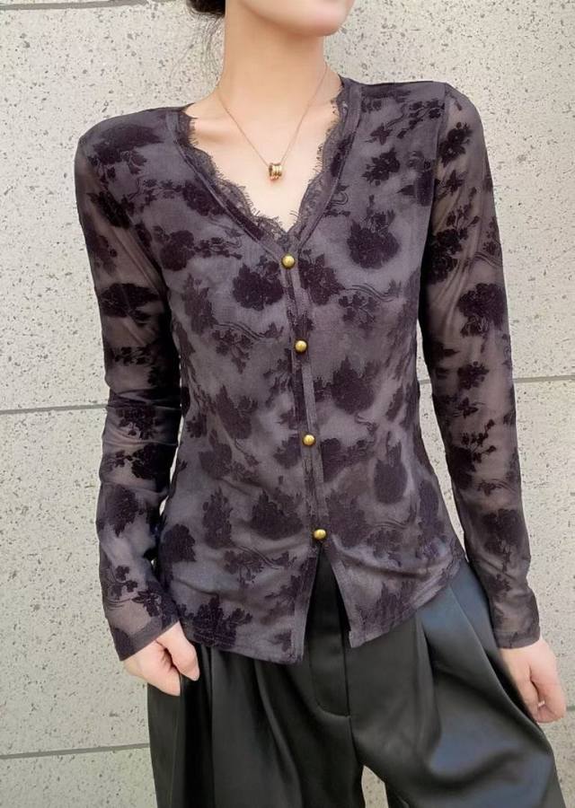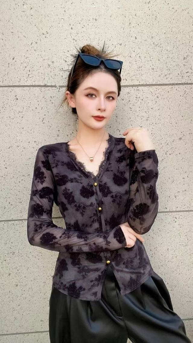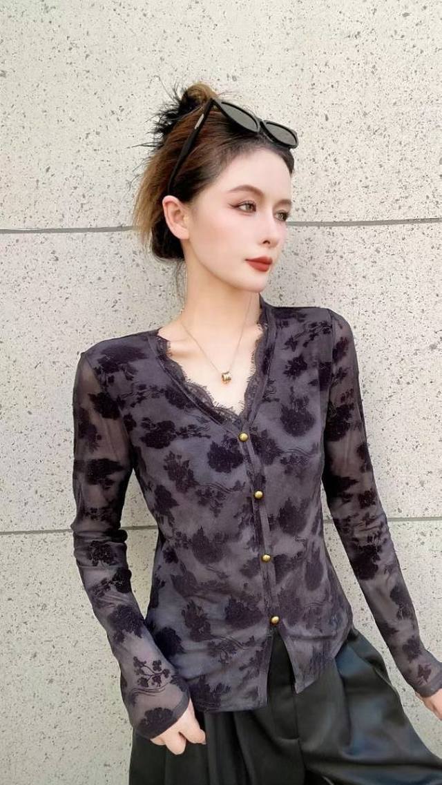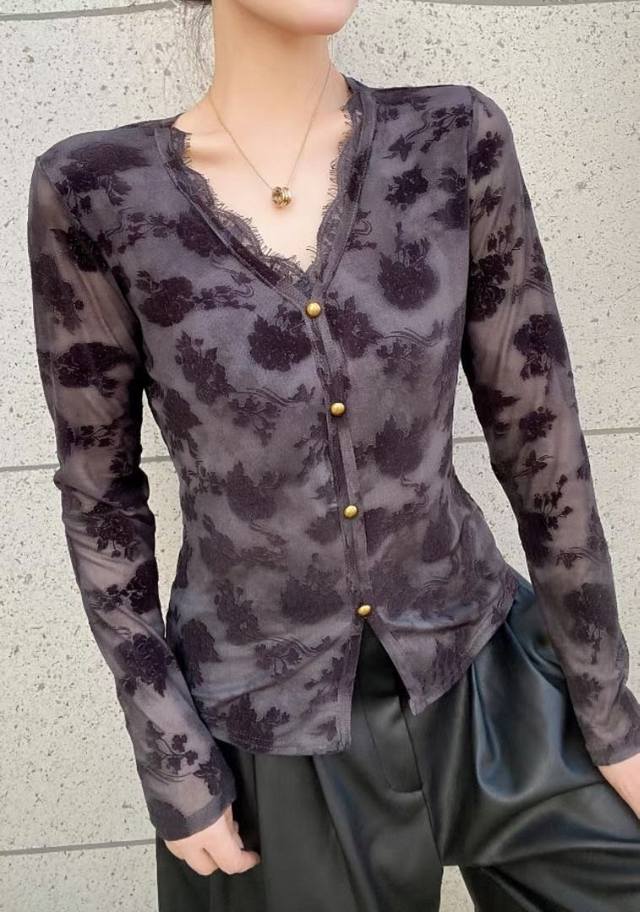 / Fashion V-neck lace flocked jacquard long-sleeved T-shirt 2025 autumn and winte