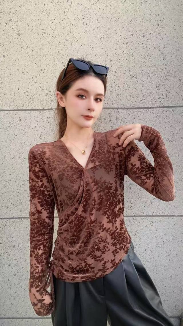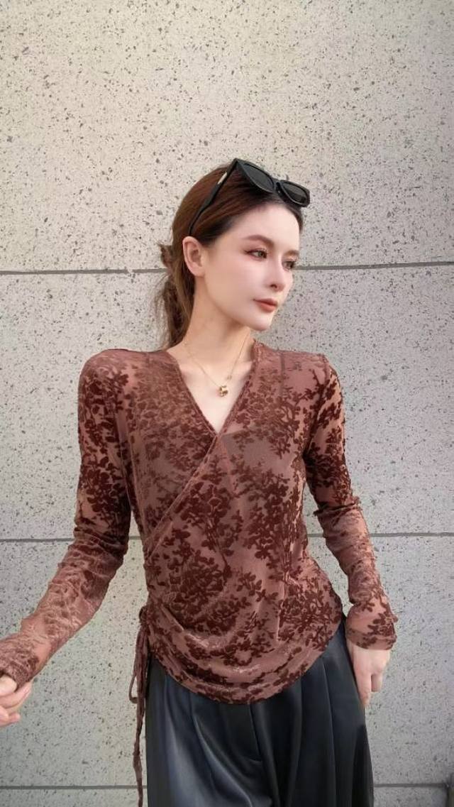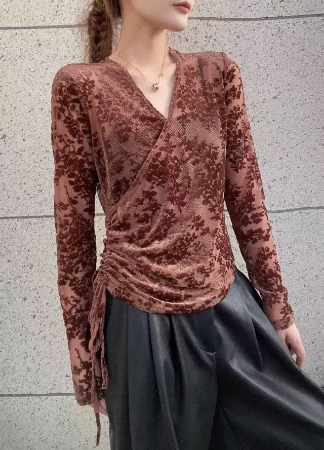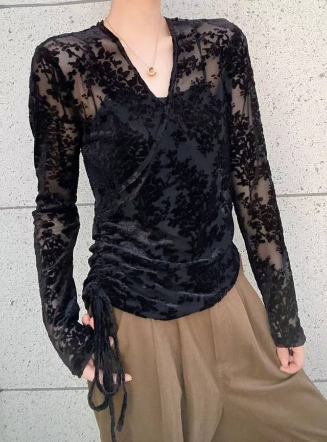 / Fashion V-neck lace flocking jacquard pleated drawstring long-sleeved T-shirt 2