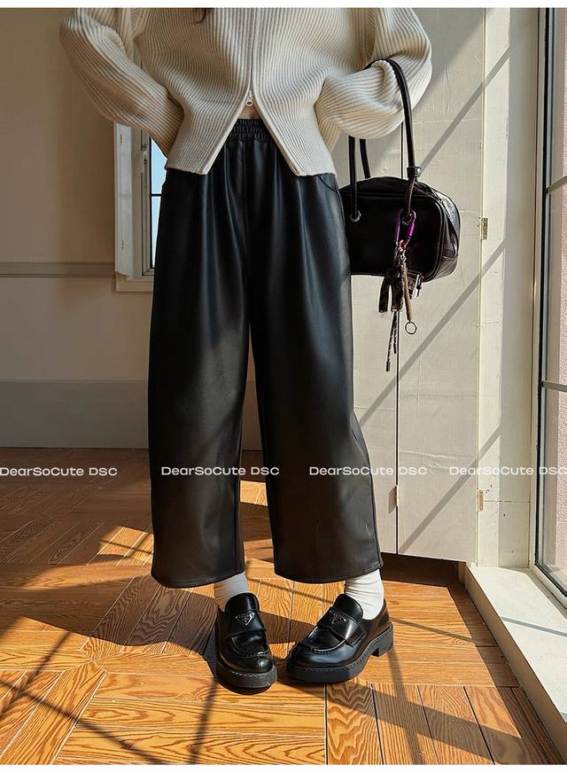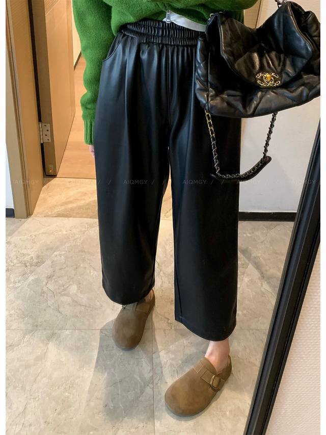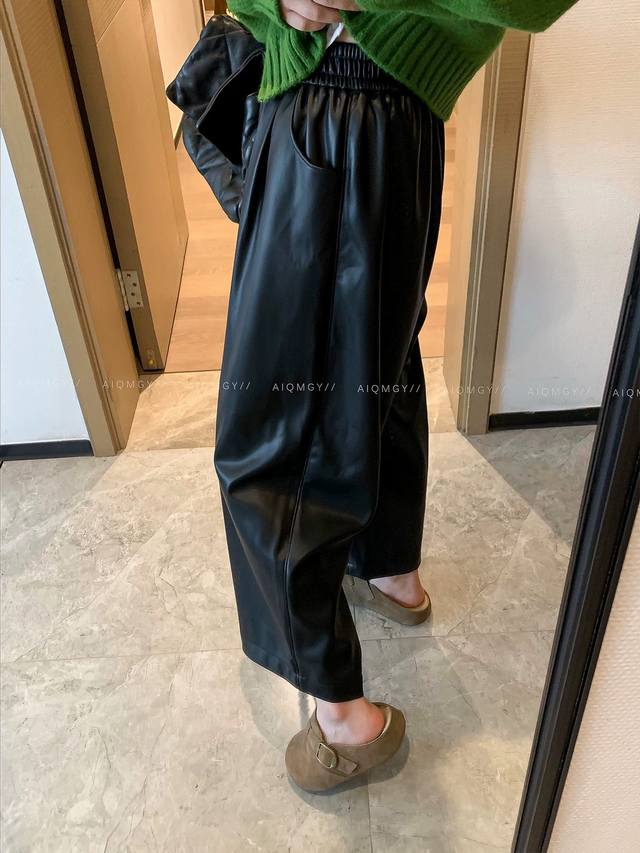 / Fashionable and elegant protein leather straight pants, elastic waist, pockets,