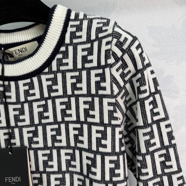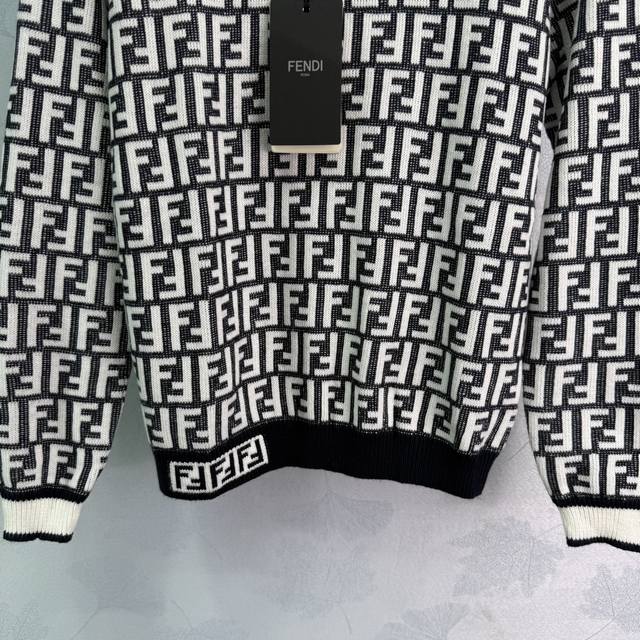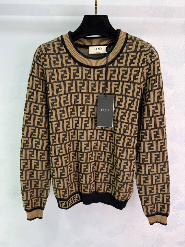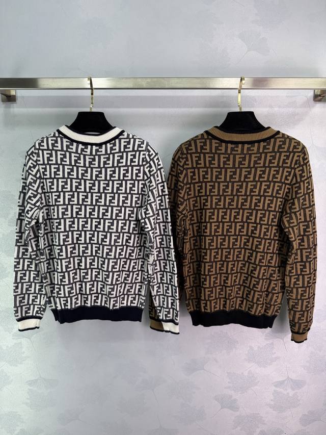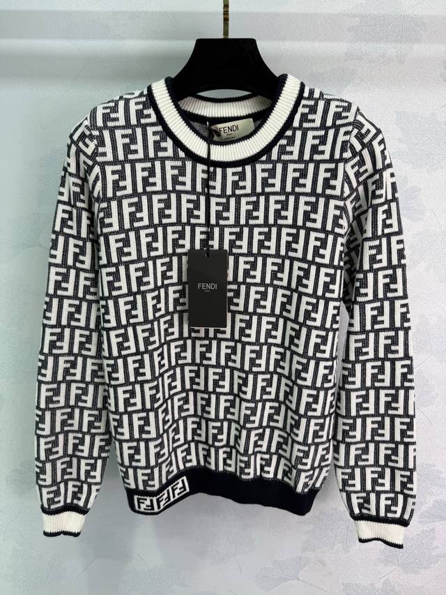 Fe* 2025 Early Fall new round-neck jacquard long-sleeved pullover sweater! Crafted from custom wool yarn, this sweater boasts a lustrous, stretchy, and comfortable texture. The round-neck, long-sleeved sweater features a solid, threaded hem, creating a narrowed design that maintains a consistent tone. The overall shape is refined, with a slim fit and double-F jacquard accents throughout, evoking a vintage-inspired style. The black, white, and brown-black color scheme creates the brand's uniquely fashionable style! Available in 2 colors and 3 sizes: Sml T226B