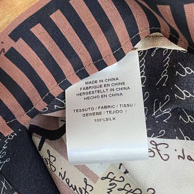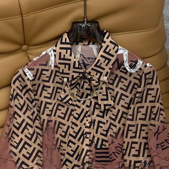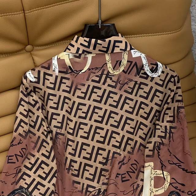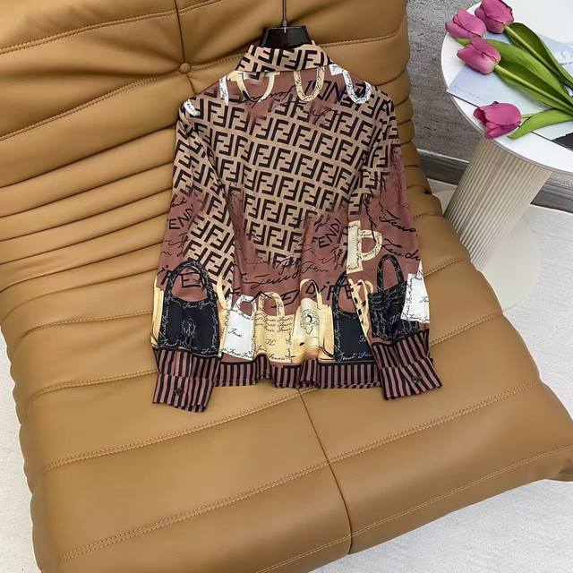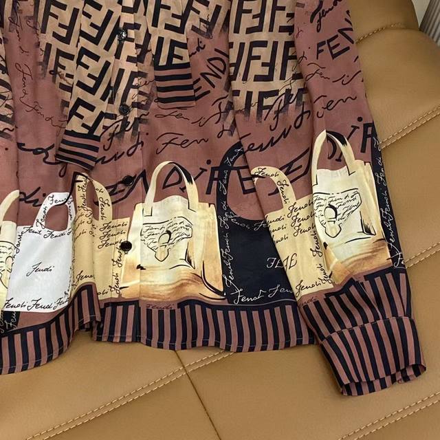 Fe2026 Sp Premium Silk Shirt. This all-over print "FF" pattern shirt is made of smooth, draping fabric. The body incorporates retro elements such as handwritten lettering and tote bag illustrations, while the cuffs feature striped paneling. Overall, it exudes an artistic feel and is perfect for creating a personalized yet sophisticated everyday look. Color: Brown. Fabric: Heavyweight Silk. Size: Smlxl.