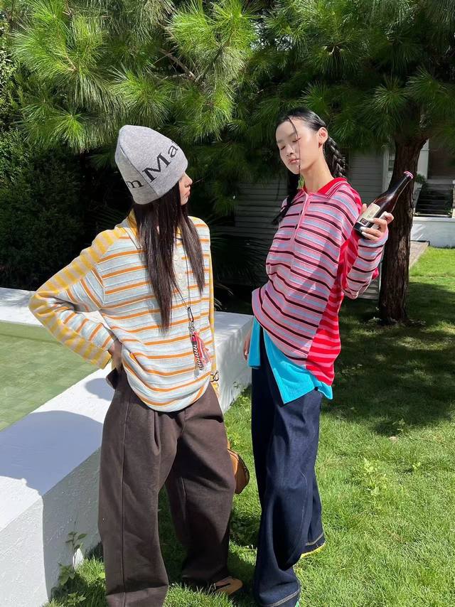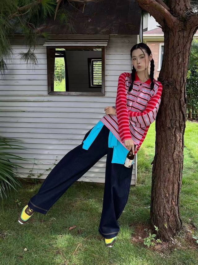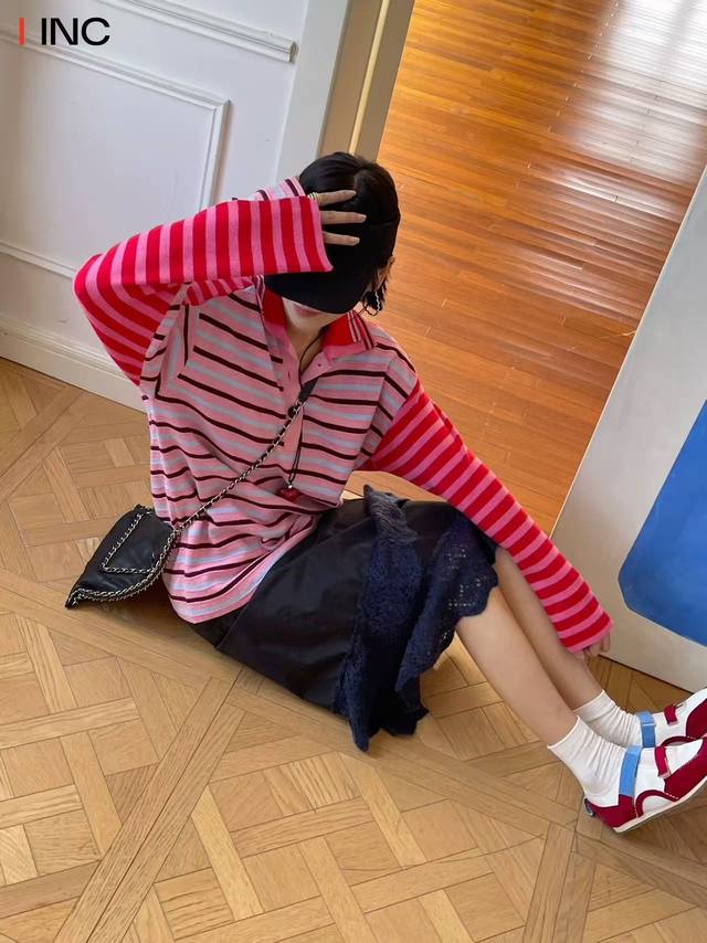 / French style age-reducing autumn new niche design contrast color striped polo c