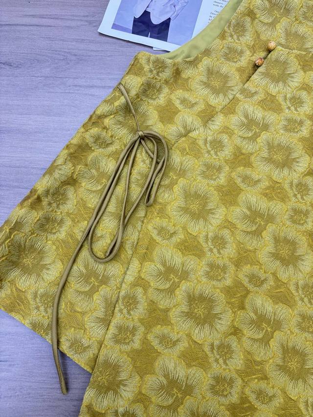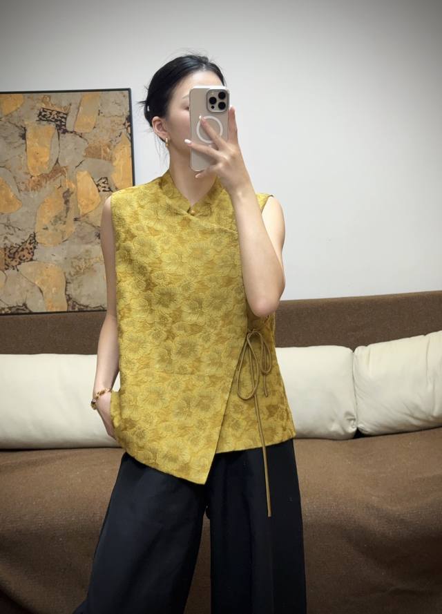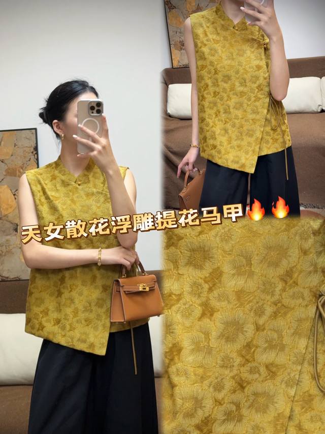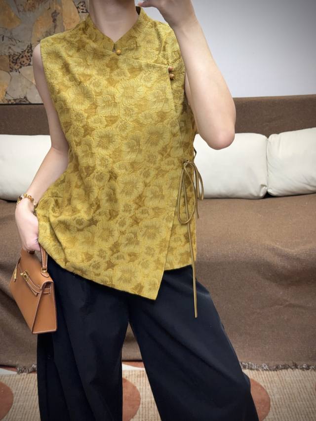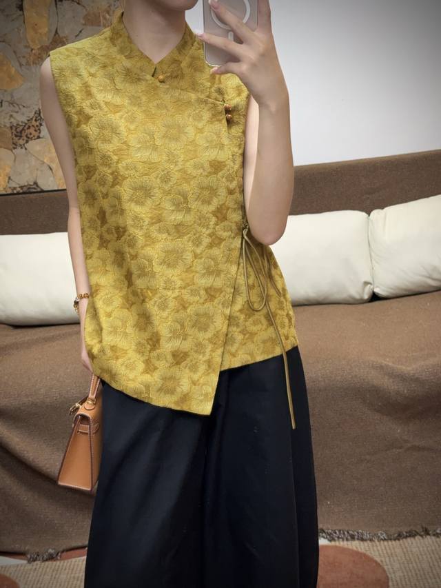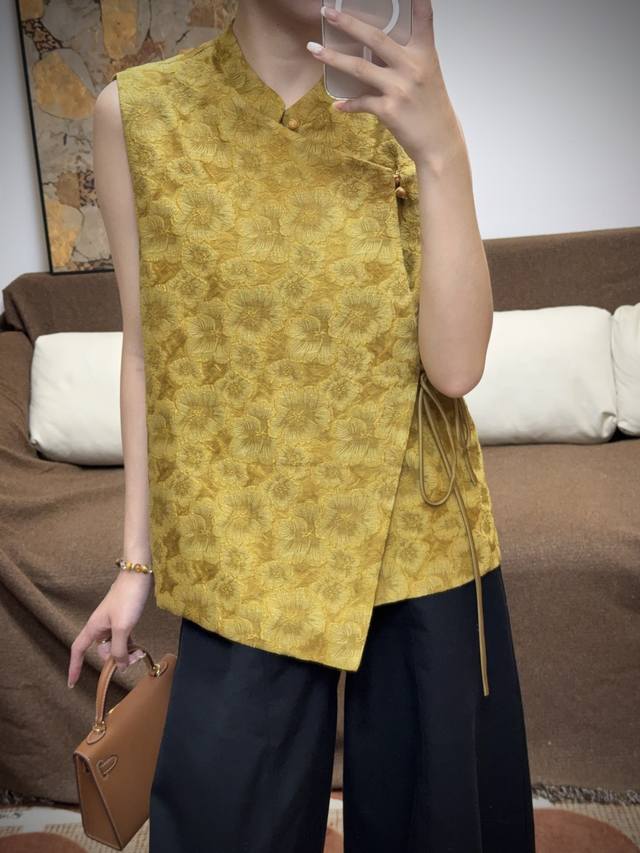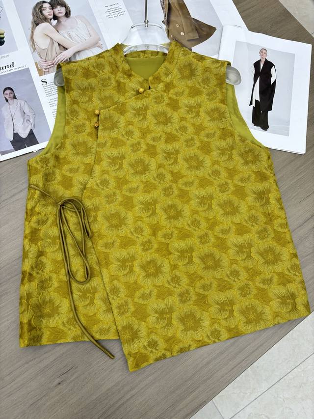 Ginger Yellow Goddess Scattered Flower Embossed Jacquard VestSleeveless Stand Co