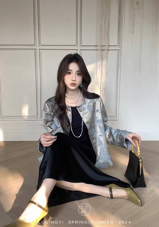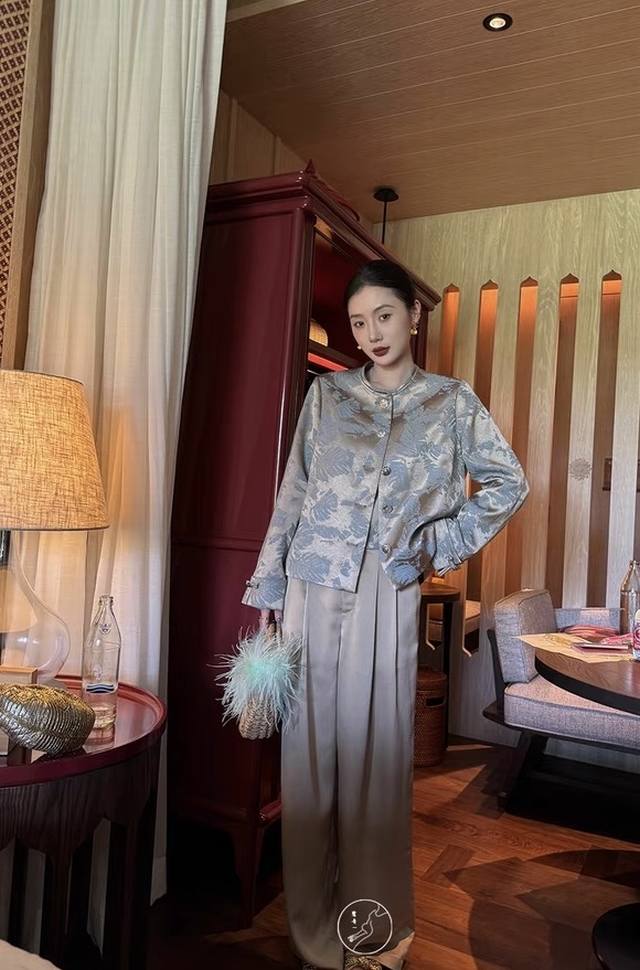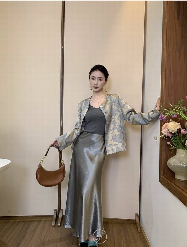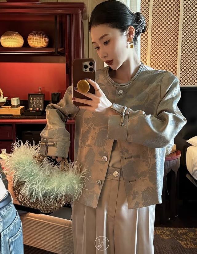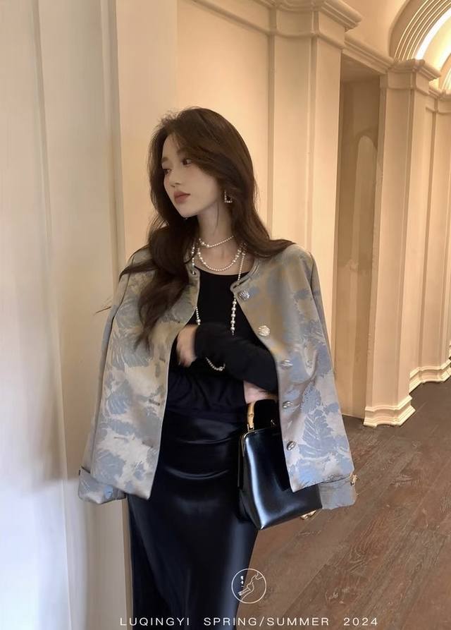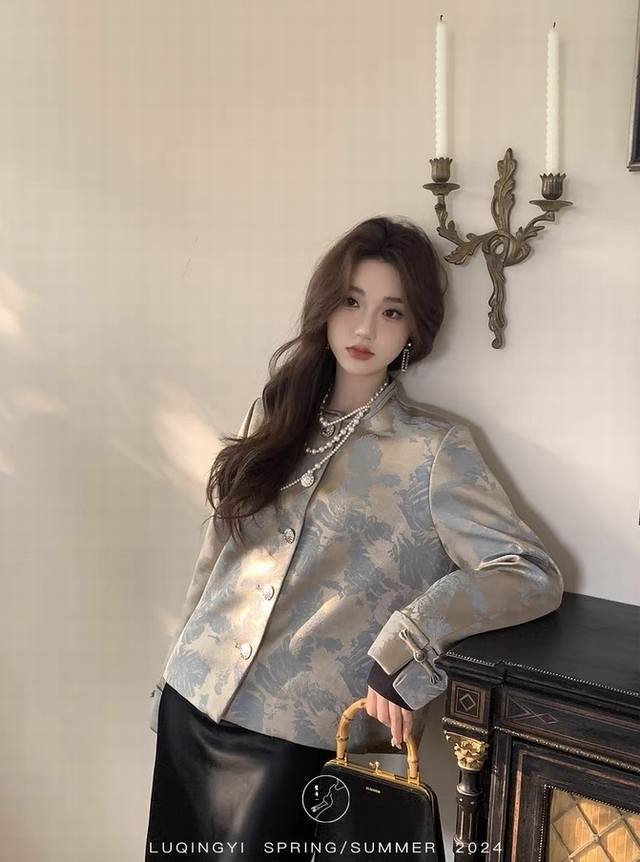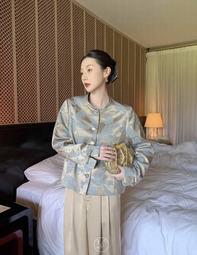 Golden jacquard fabric with an irregular banana leaf pattern. Short round-neck H-shaped jacket, simple and elegant overall. Moderate looseness, both wrapping and not too bulky. Incorporating traditional print elements, exuding the charm of oriental aesthetics. Smlxl