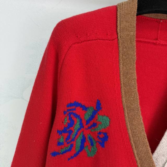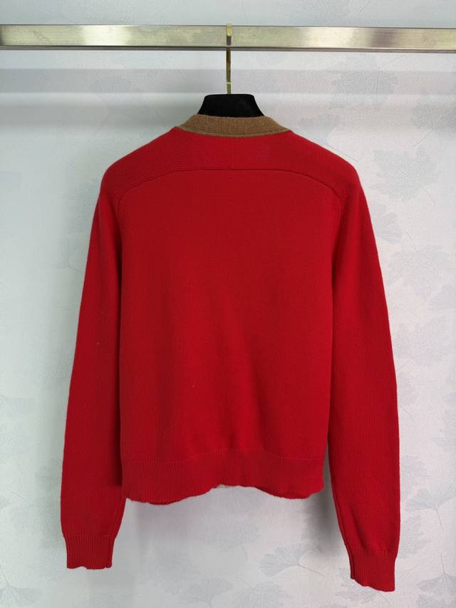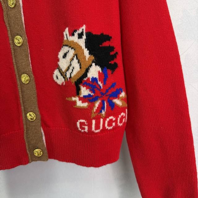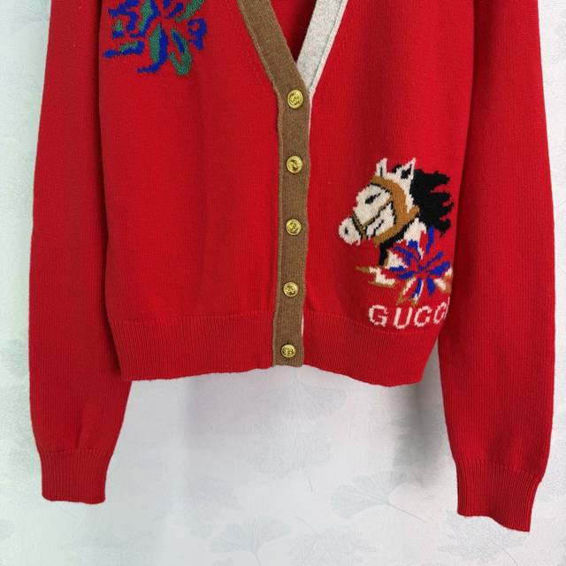 Gu*2026 Early Spring New Zodiac Series Knitted Cardigan, wool blend, soft and skin-friendly, red main color, paired with twelve zodiac jacquard, horse year elements are super festive, V-neck color blocking design