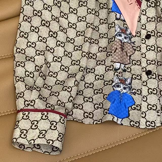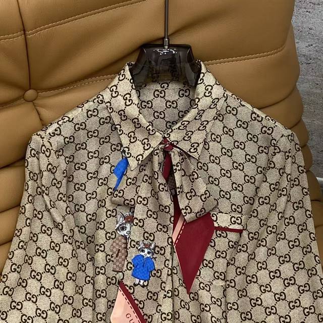 Gu2026 Sp Premium Silk Shirt This shirt features an all-over print of the classic double G pattern. Made from smooth silk fabric, it boasts a colorful patchwork neckline with a tie detail, and red trim on the cuffs. The overall look is retro yet full of personality, perfect for creating a stylish everyday or vacation look. Color: Floral Fabric: Heavyweight Silk Fabric Smlxl DDD