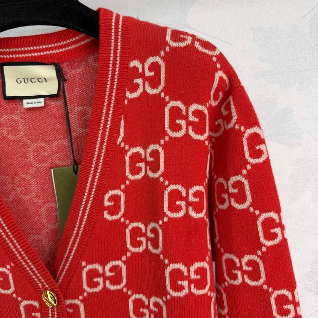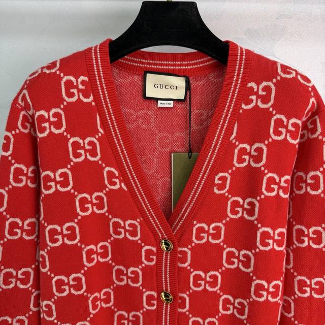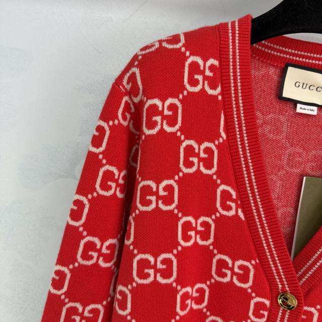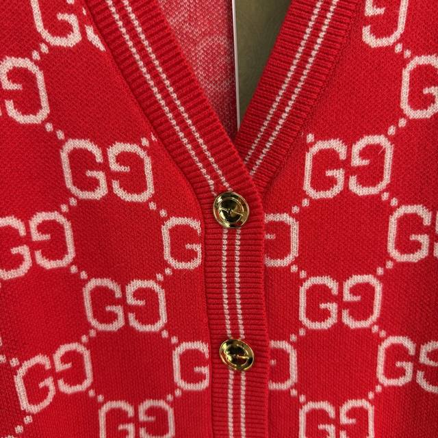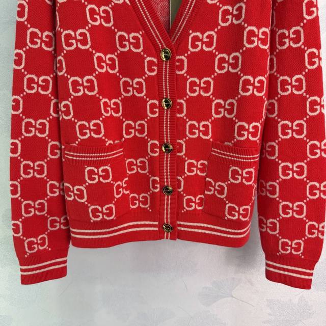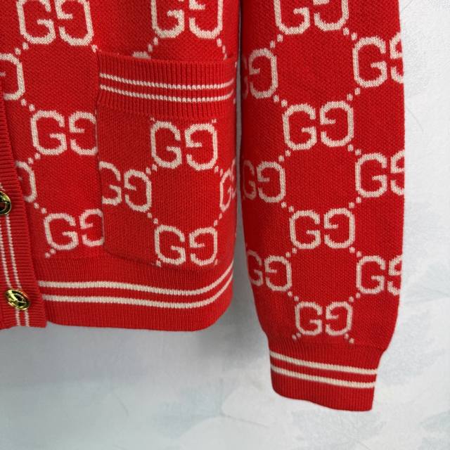 Gu*25 Autumn/Winter New Gg Jacquard Knit Cardigan. The bright red is eye-catching, with white double G letters interwoven for maximum recognizability. The V-neck and gold button design exude a retro, preppy style. The fabric is soft and skin-friendly, and looks stylish whether paired with a T-shirt or a shirt, easily creating a casual yet sophisticated look! 1 color, 3 sizes: S, M, L, T226B. DDD