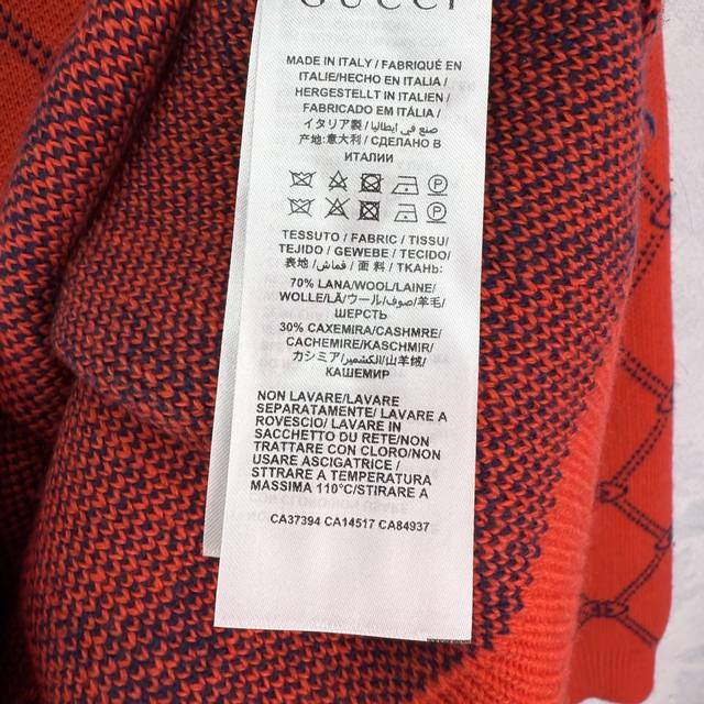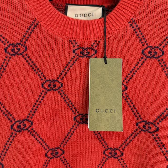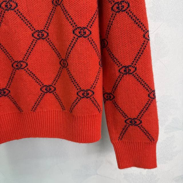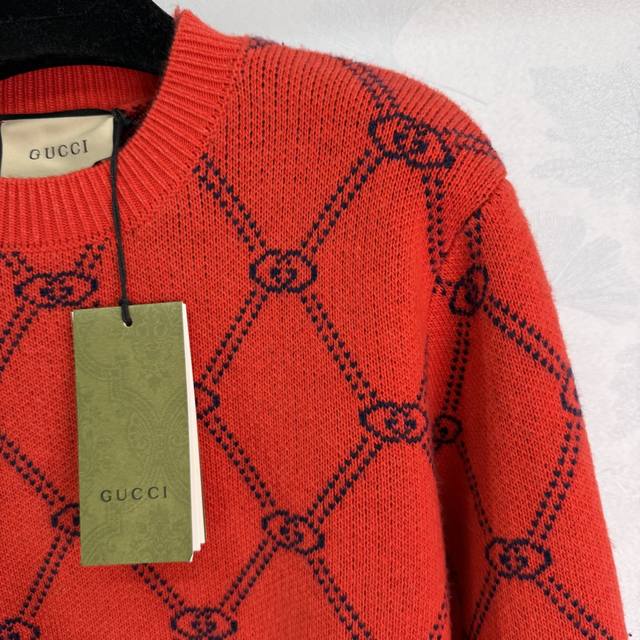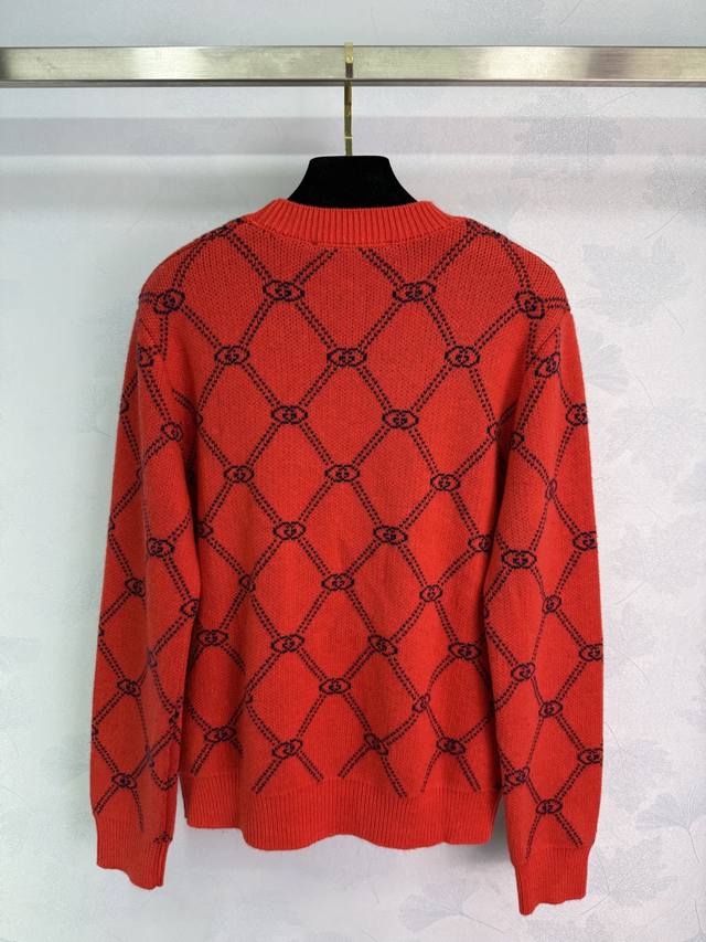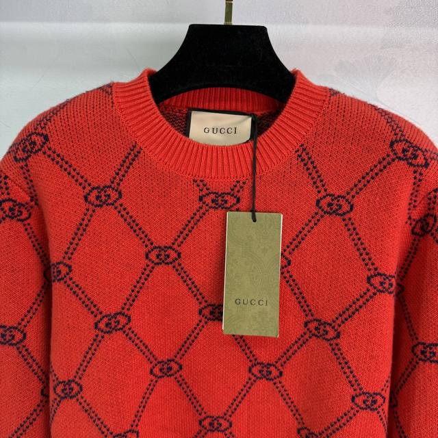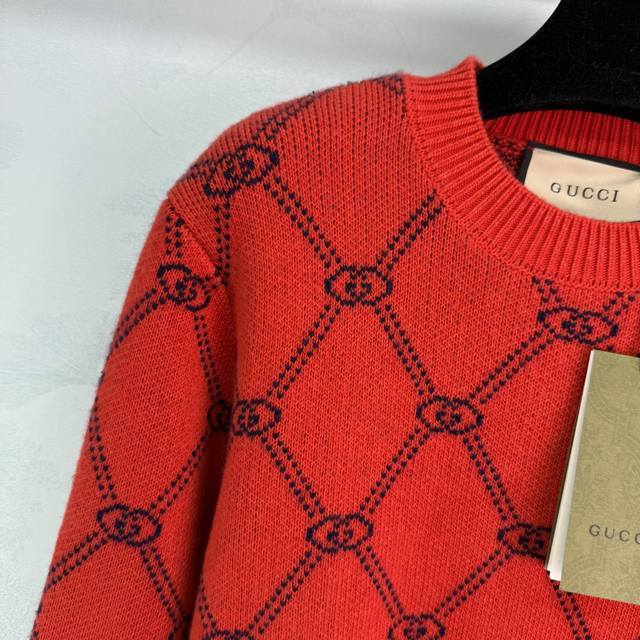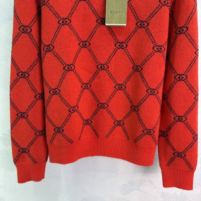 Gu*25 Autumn/Winter New Red Double G Diamond Pattern Sweater. Classic all-over print design, soft and comfortable wool fabric, round neck pullover style. The overall look is sophisticated yet casual, creating a fashionable and unique brand style! 1 color, 3 sizes: S, M, L, DDD