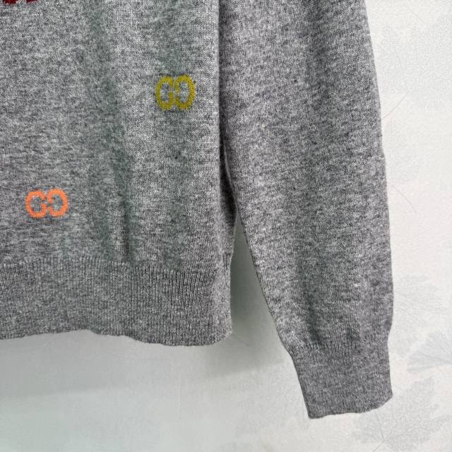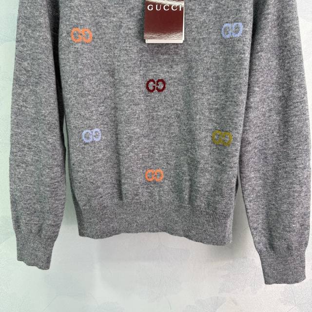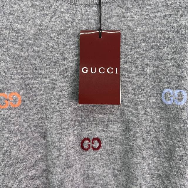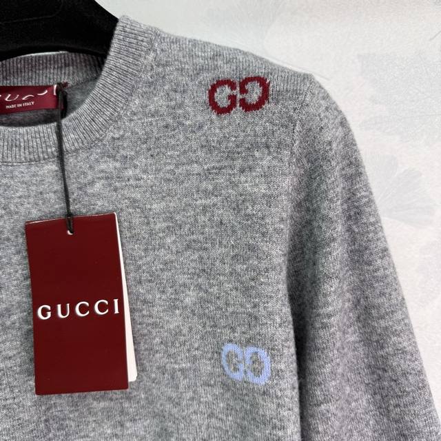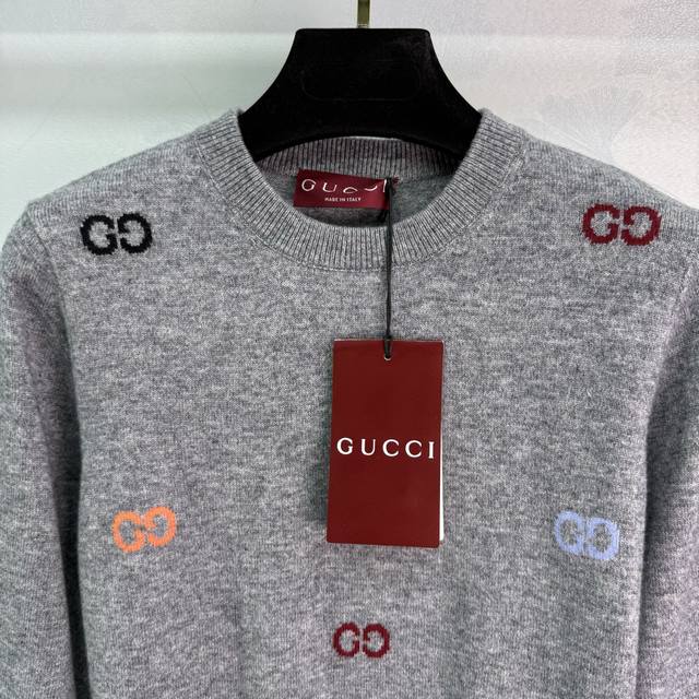 Gu*25 Early Fall new round-neck knit sweater, custom-made from wool with a delicate feel. Embellished with a Gg jacquard pattern throughout, showcasing the brand's premium style. Contrasting colors add a touch of depth! One color, three sizes. Sml T226B.