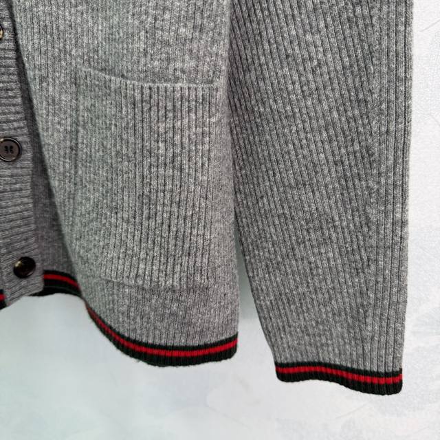 Guc*I 2025 Early Autumn New Solid Color Knit Cardigan! Custom Yb wool knit material, comfortable and soft. V-neck knit cardigan with contrasting ribbed trim on the neckline and cuffs. Comfortable and stretchy. Double side pockets add style. Striped contrasting embellishments highlight the garment's character while adding a touch of vibrancy. Regular fit with a smooth cut, relaxed and fashionable. A must-have for autumn and winter fashion! Can be paired with matching trousers. 1 color, 3 sizes: S, M, L, T226B. DDD