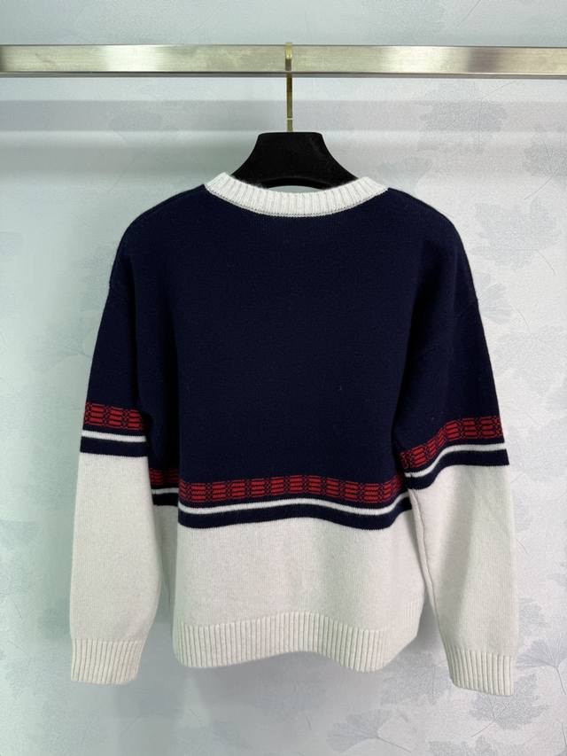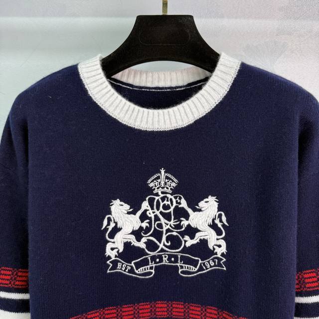 He*25 Early Fall New British-style embroidered sweater with a dark blue and off-white warhorse emblem. A luxurious feel. Imported yarn, Swiss-woven. Elegant, slimming, versatile, and sophisticated! 1 color, 3 sizes. Sml T226B.