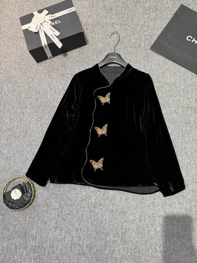 Whoever takes it will make up the order! Chinese style small stand-up collar and side placket design, beaded butterfly embellished silk velvet long-sleeved top! Highly recommended!