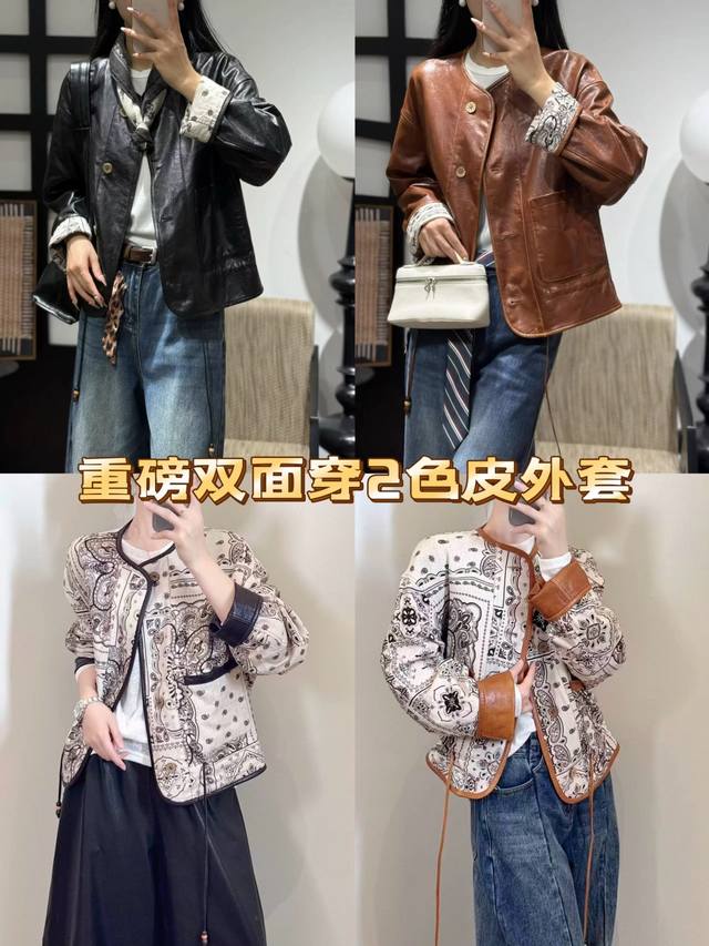 Heavy-duty double-sided 2-color leather jacket! High quality! High-end 2025 early autumn new double-sided imitation sheepskin leather jacket for women High-quality light luxury waxed leather jacket Linen print jacket 2 colors coffee color, black Smlxl