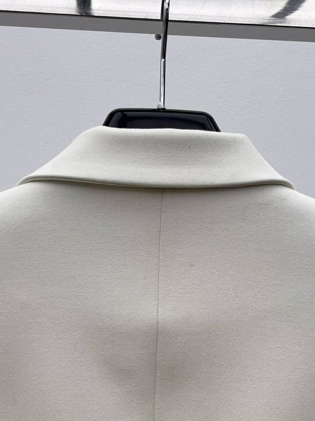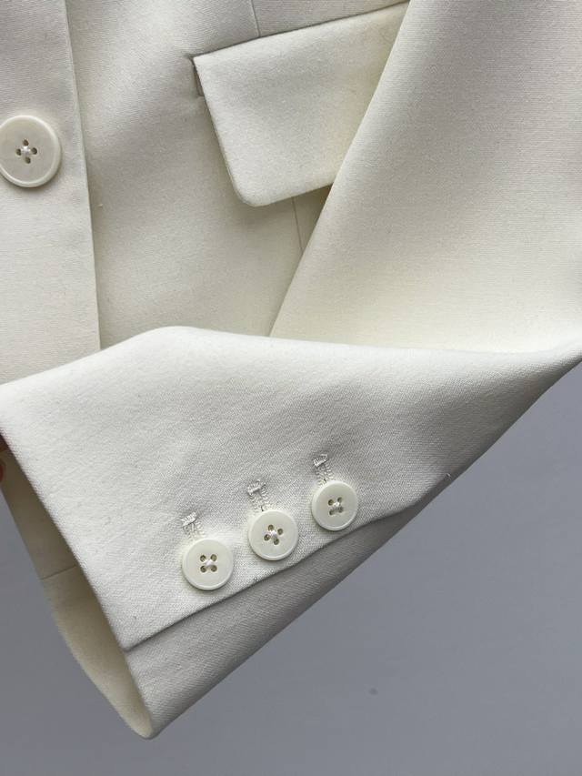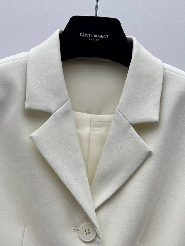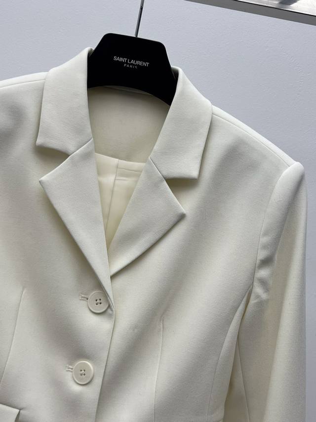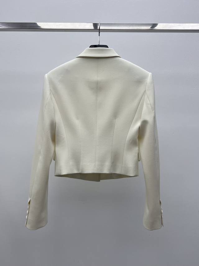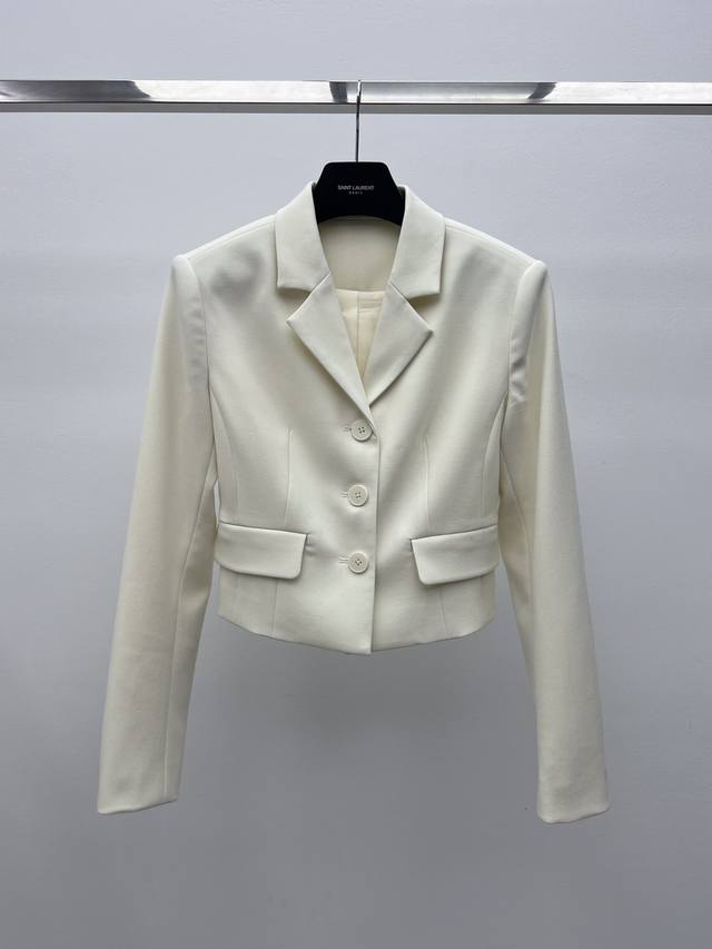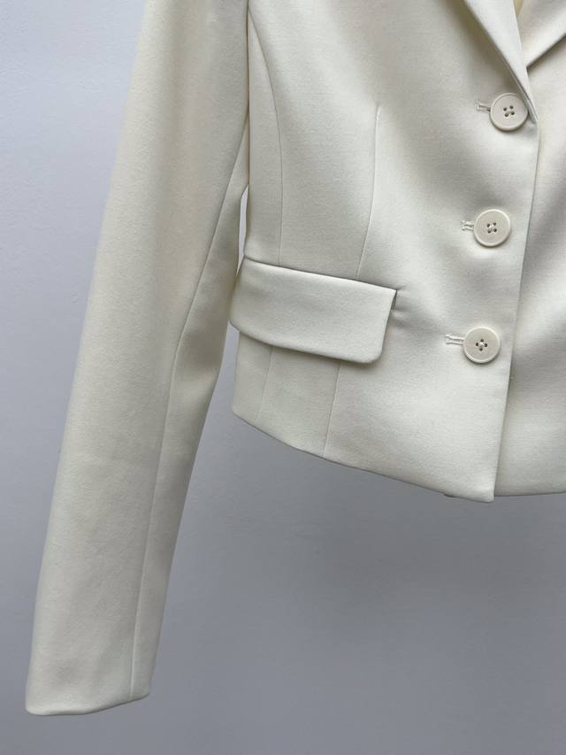 The short, fitted silhouette features a single-breasted closure