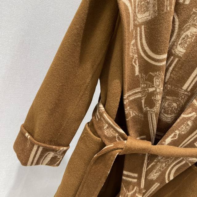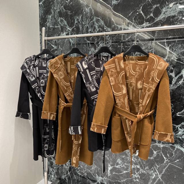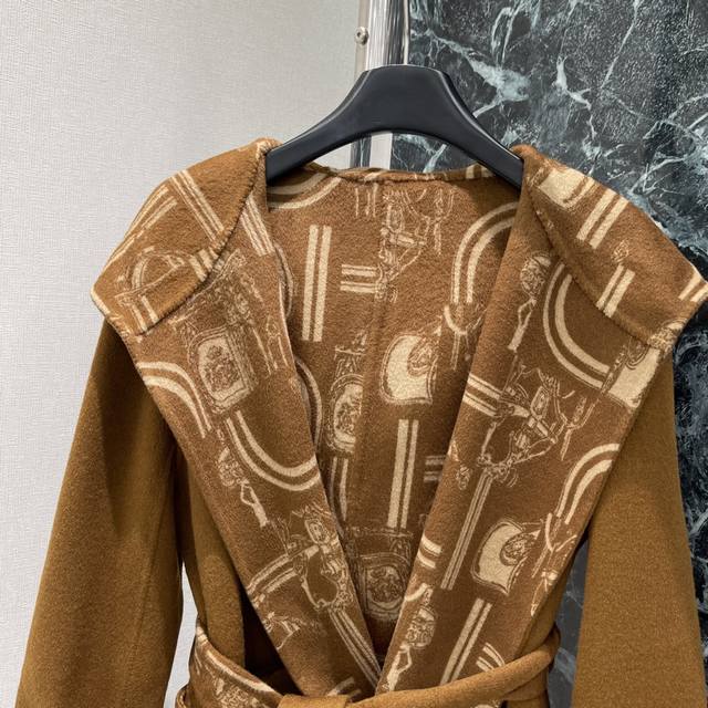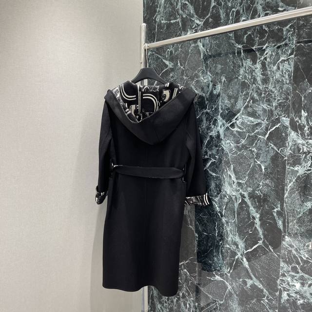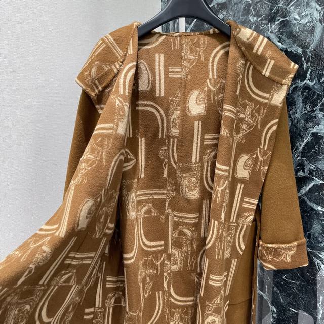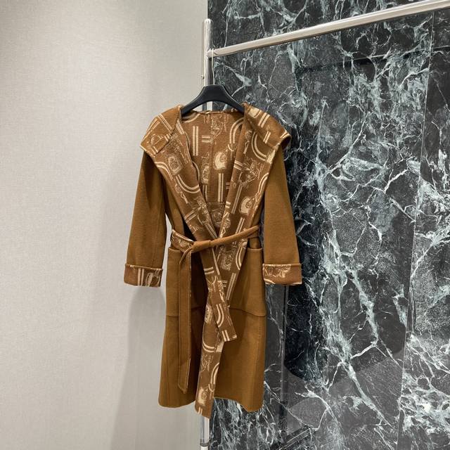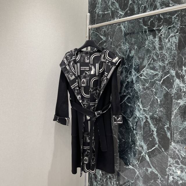 Her 25 Early Fall new hooded, monogrammed long knitted coat. The heavily crafted jacquard pattern is meticulously detailed. The irregularly arranged contrasting colors throughout the body complement the retro and elegant style. The strong, understated feel exudes sophistication, easily adapting to any style. Perfect for everyday travel or gatherings. Two colors: Sml