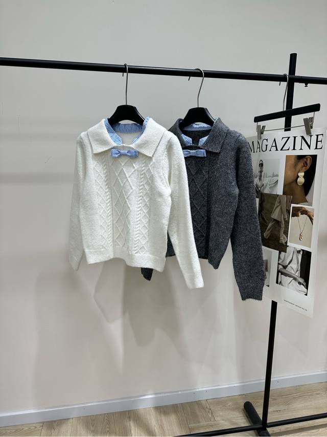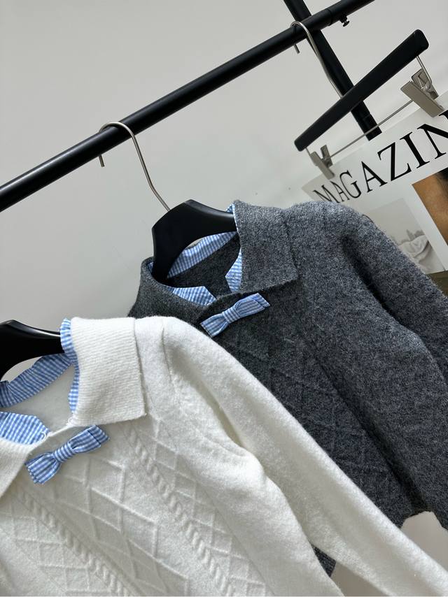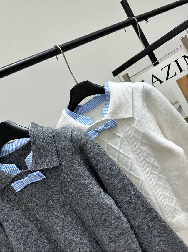 Her Blue Plaid Bow Tie Long-Sleeved Collared Sweater Ddd. Fabric: Wool Blend Ddd Colors: Gray, White Ddd Herlian Girls