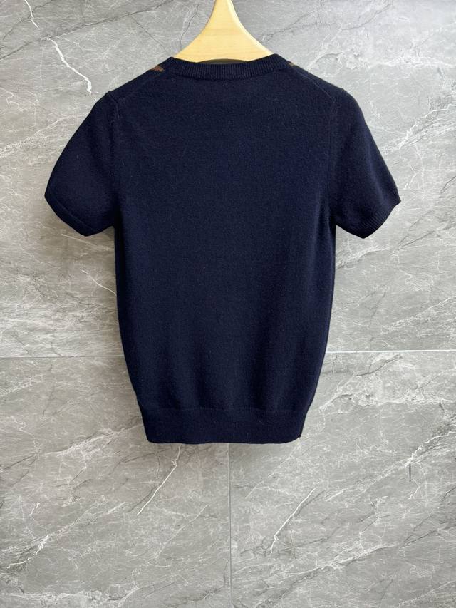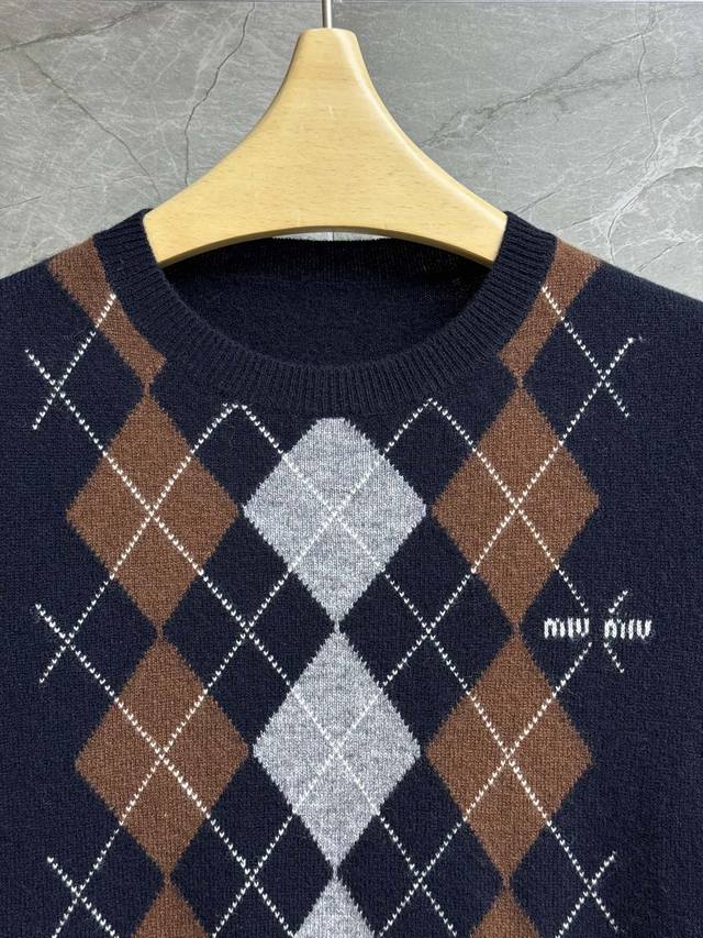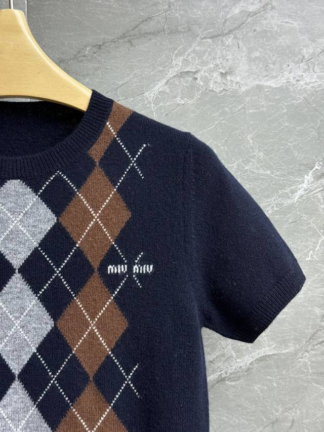 Miu diamond cashmere short sleeve 2025 early autumn series round neck ribbed design diamond letter intarsia pattern color retro and fashionable cashmere knit fabric soft and glutinous skin-friendly slim version upper body slim and elegant can be worn with the brand full size Sml