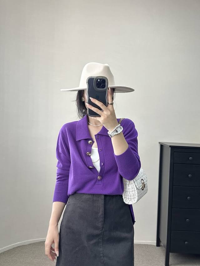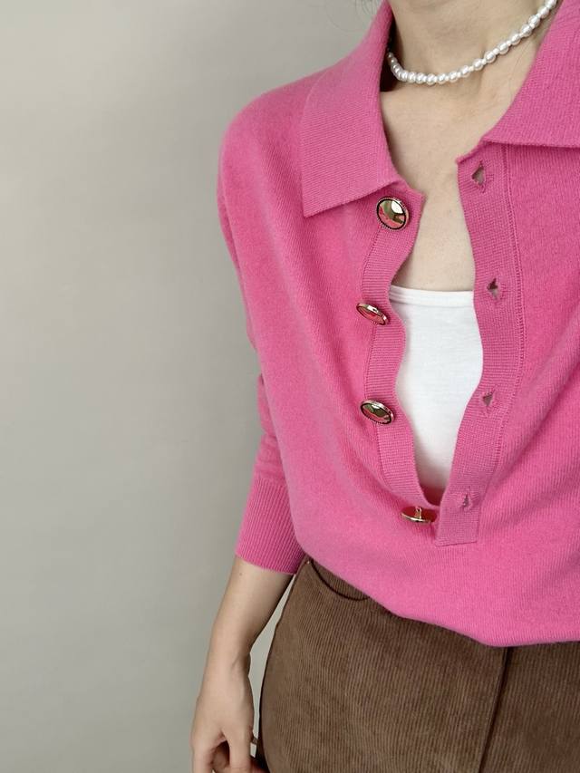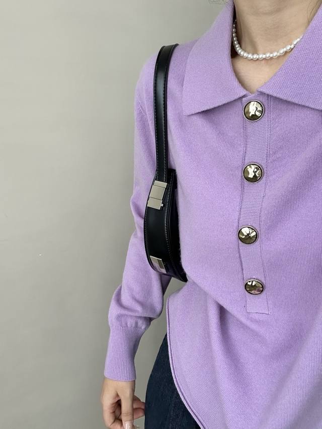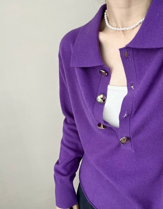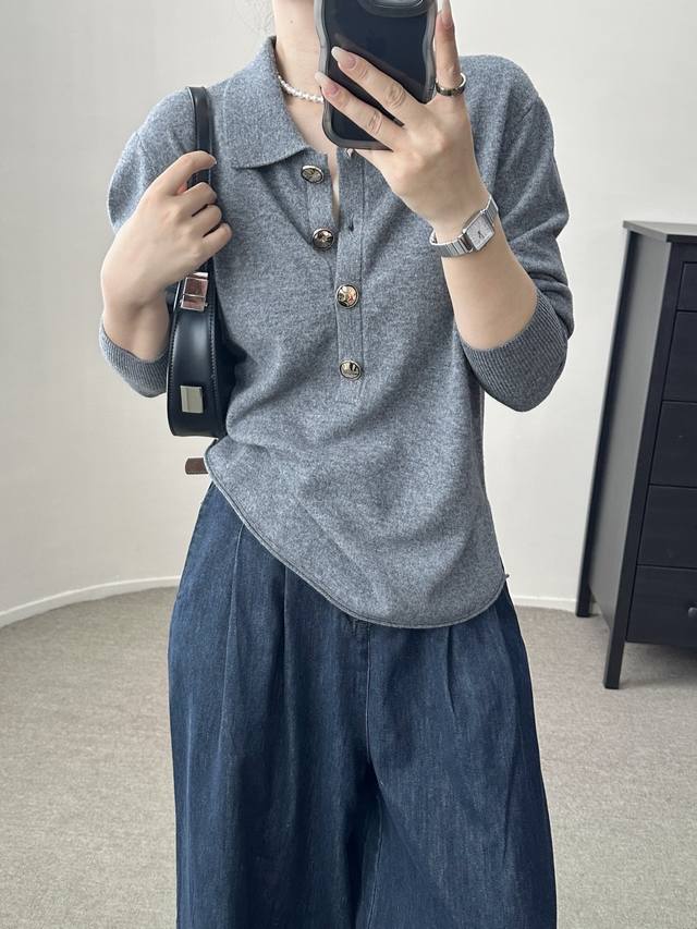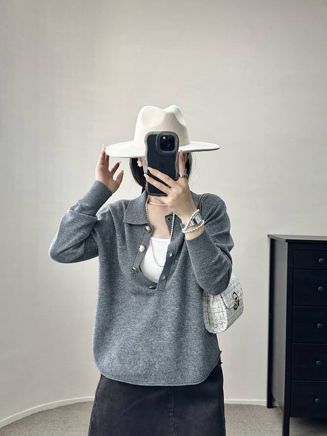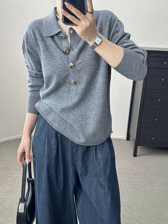 / High-end temperament commuting polo collar retro gold button wool sweater autum