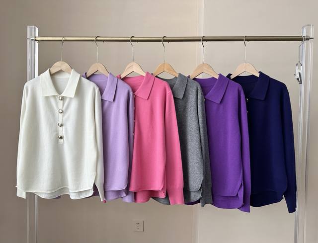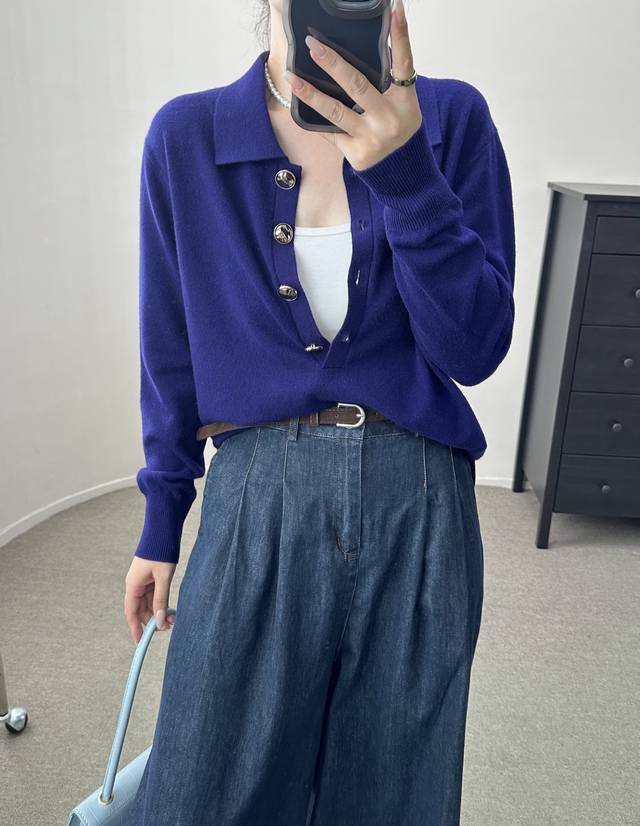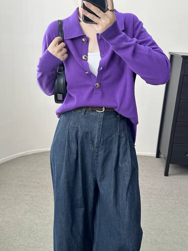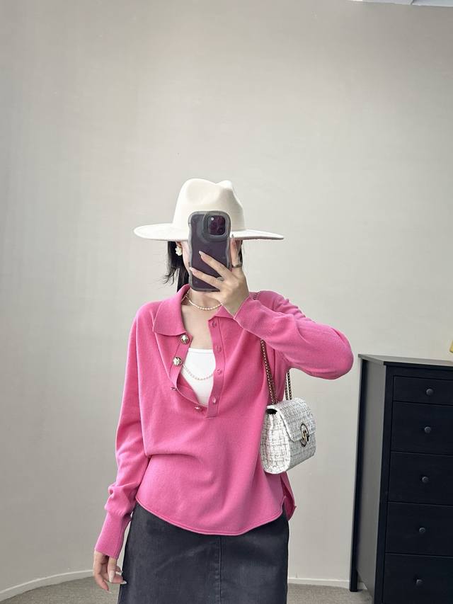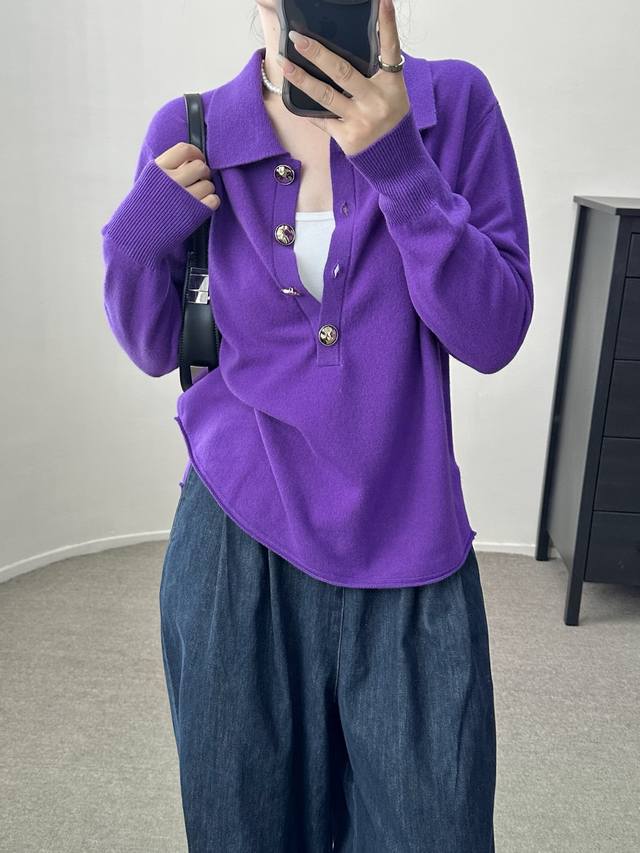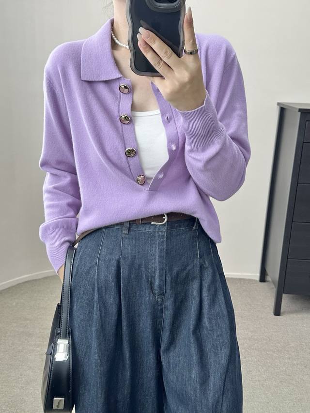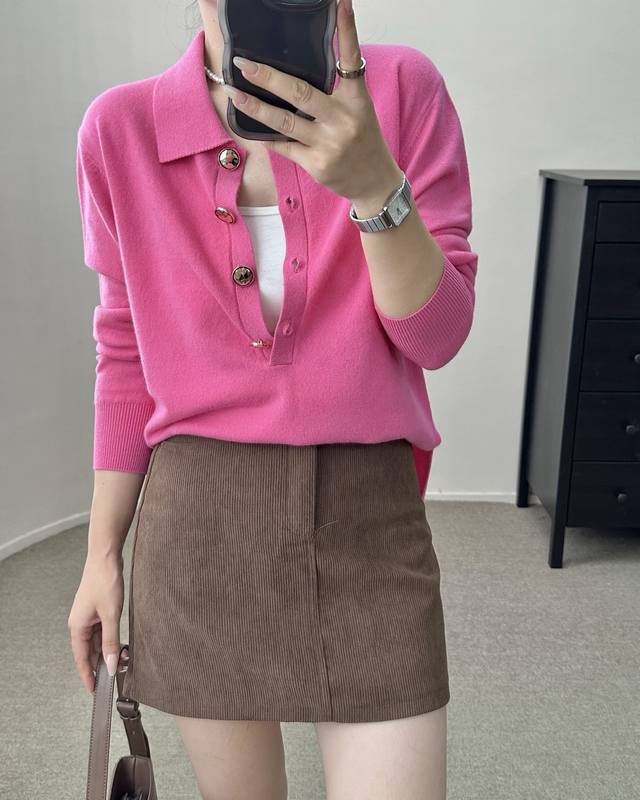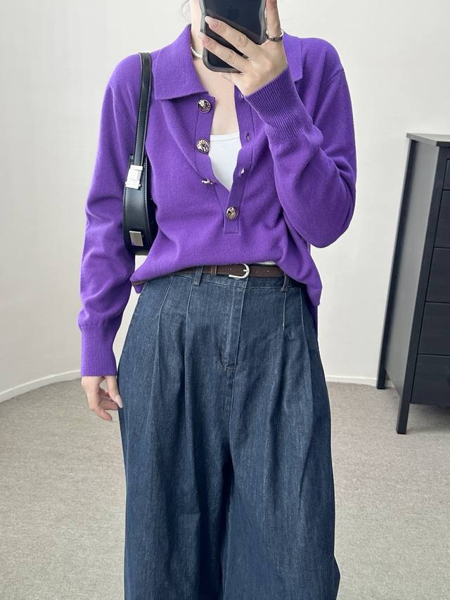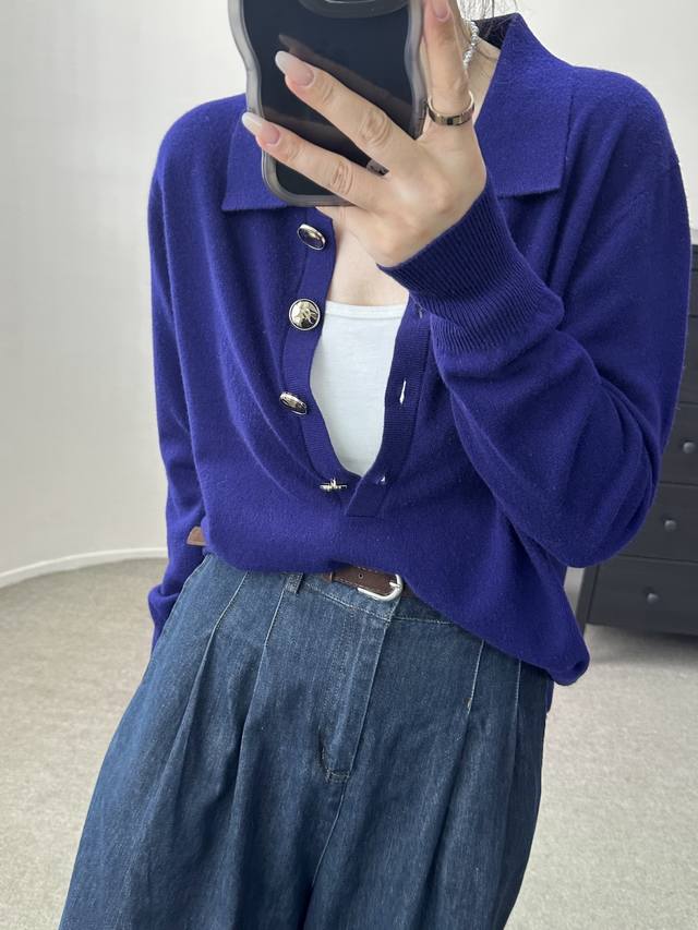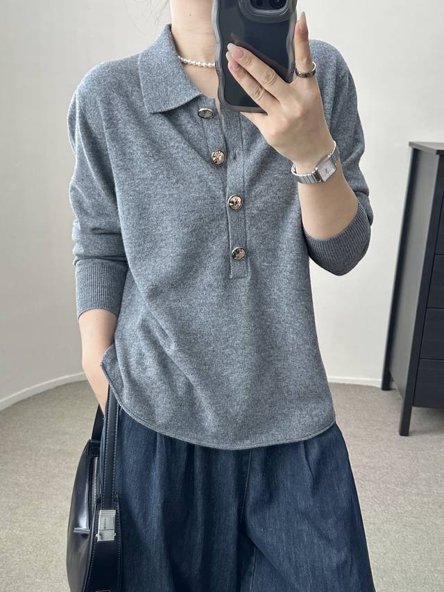 High-end temperament commuting polo collar retro gold button wool sweater autumn and winter new one size full wool