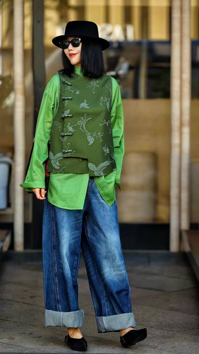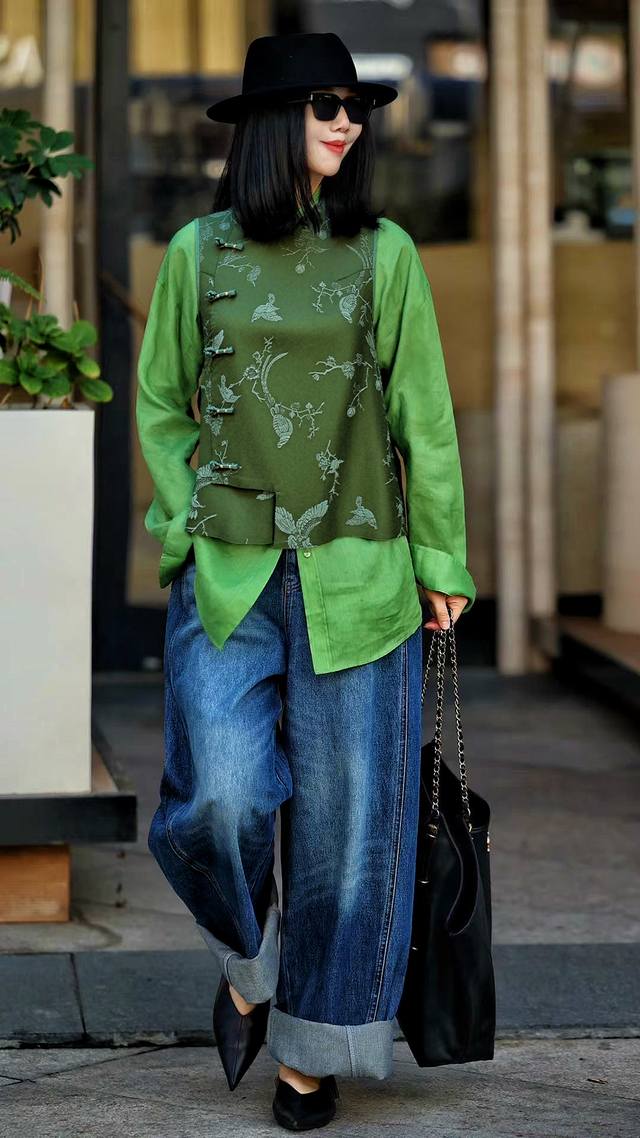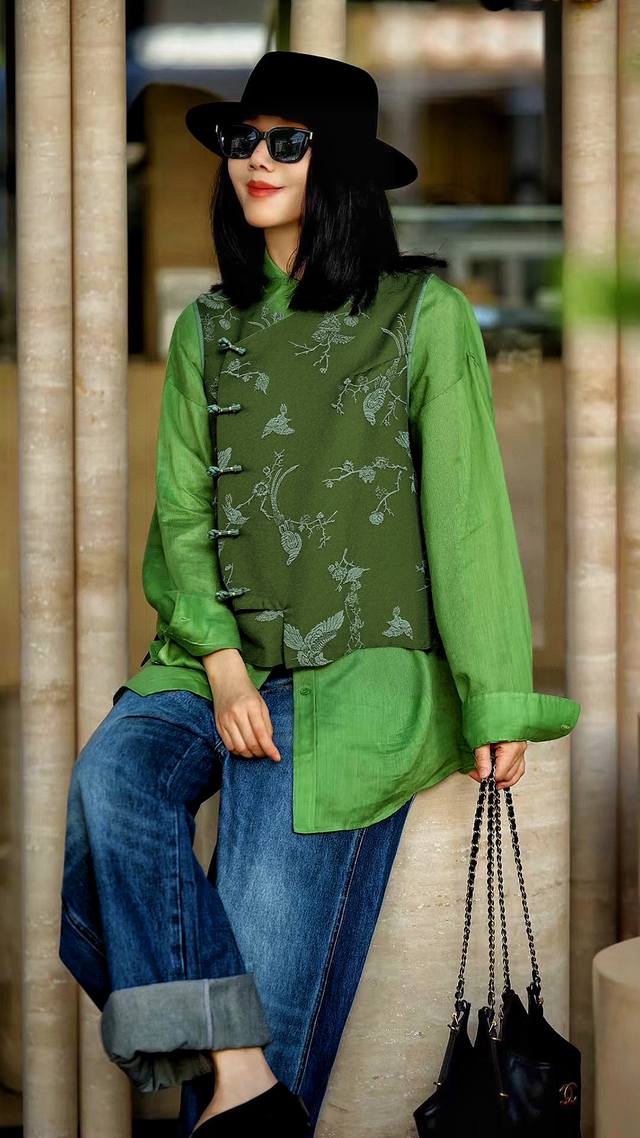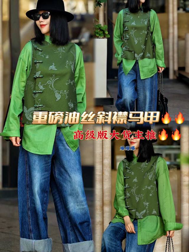 High-end oil-silk vest. Rich dark green, calm and stylish. The oil-silk material has a unique luster that emanates a low-key and luxurious texture as the light flows. The exquisite flower and bird embroidery is delicate and lifelike. The Chinese-style oblique collar and button design are full of classical charm. Every detail highlights the charm of oriental aesthetics, showing elegance and style. Smlxl