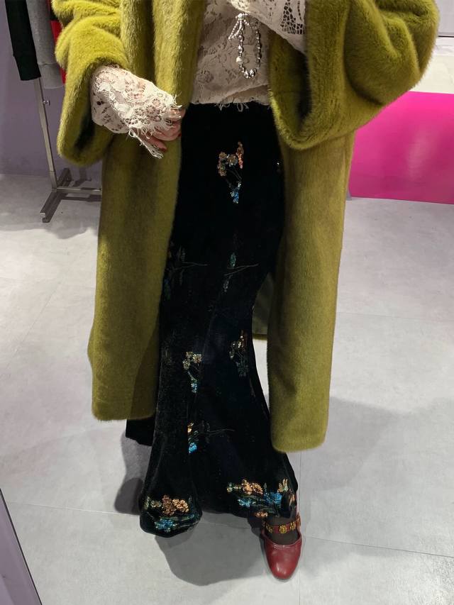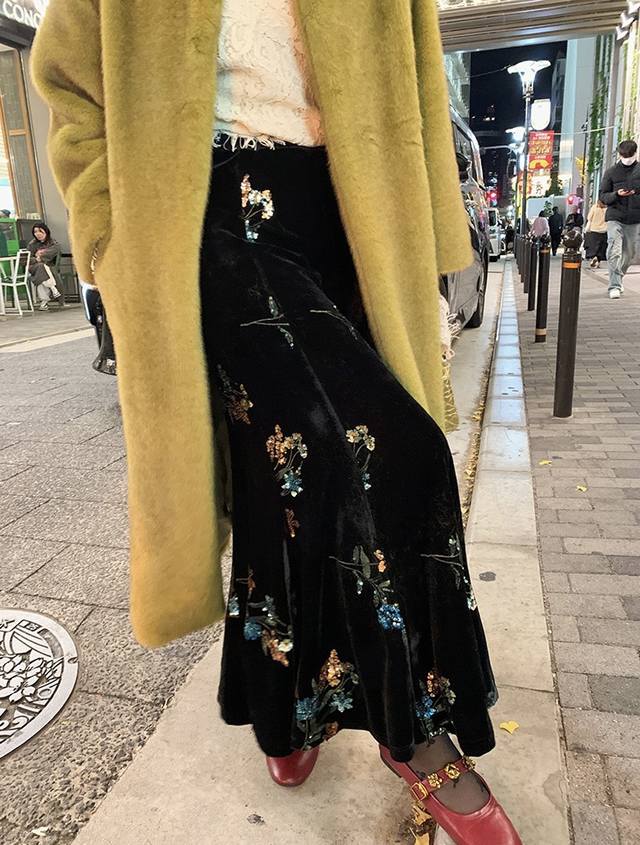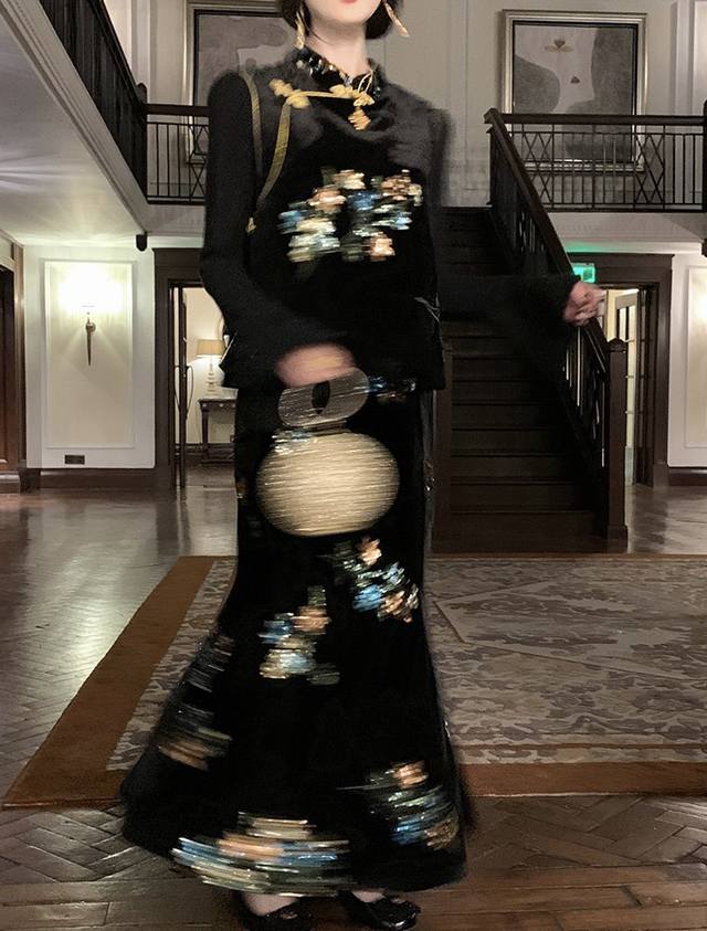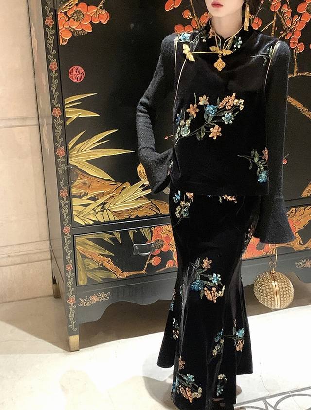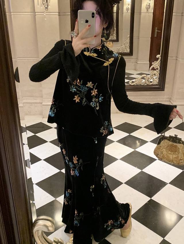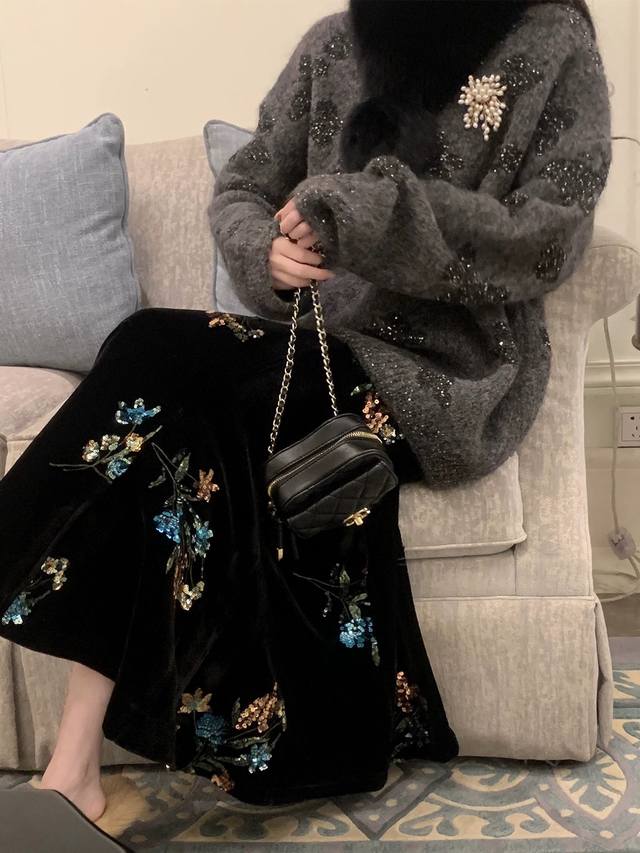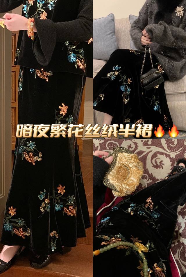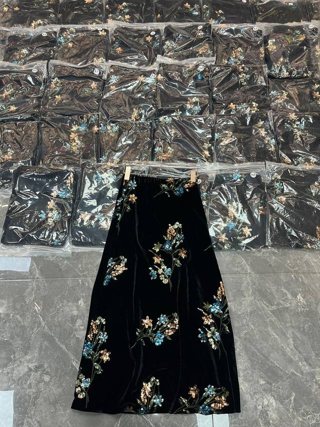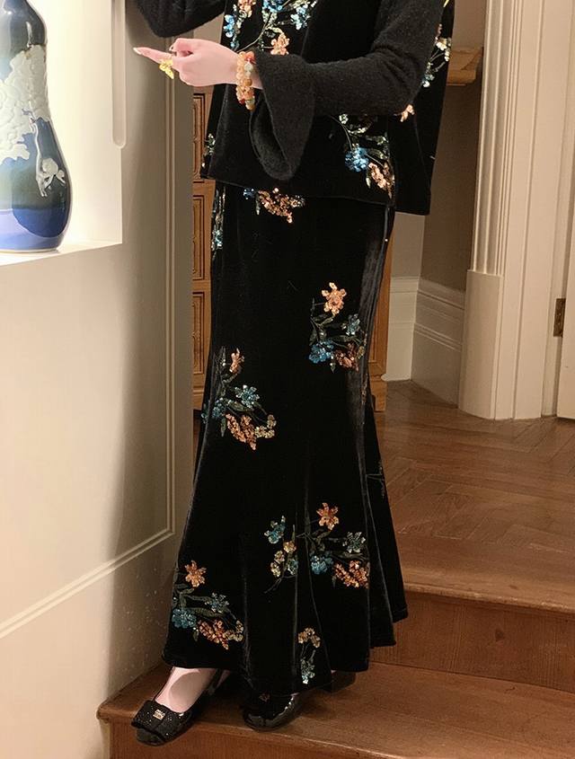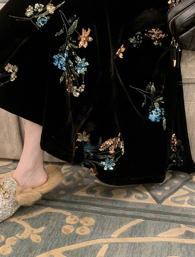 High-end version shipped in large quantities Dark Night Flowers Retro New Chinese style heavy embroidered velvet skirt, the three-dimensional bead embroidery has regular shapes and rich colors, and the pattern is exquisitely outlined. Under the light, it is like stars with a luxurious feel. The high waist cut cleverly modifies the body proportions and easily has long legs. It is loose and lazy and elegant. Smlxl