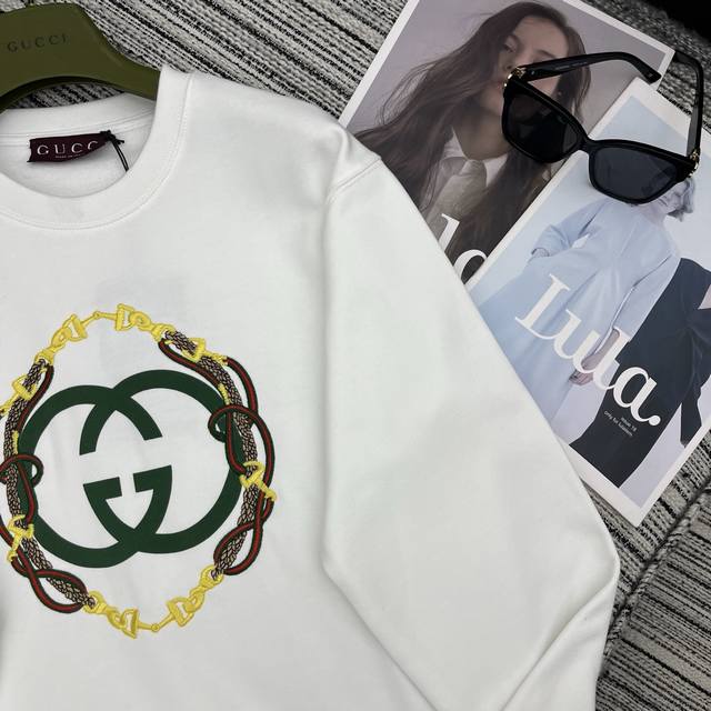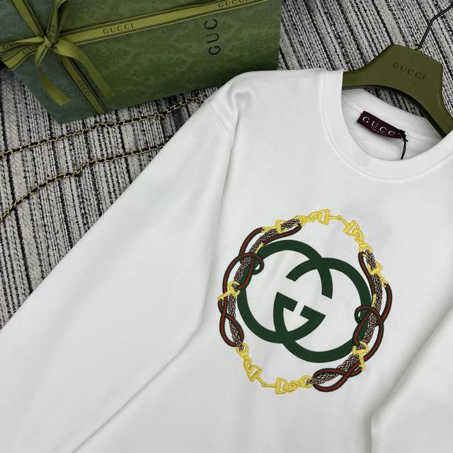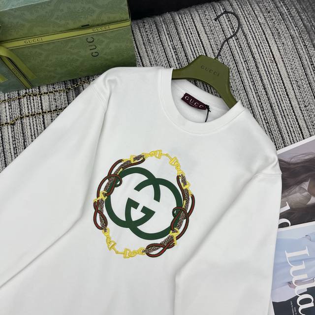 Highly Recommend GUCCI 2026 Early Spring New Year Limited Edition Drop-Shoulder Loose-Fitting Printed Embroidered Crew Neck Sweatshirt | Exclusive Yb Development! Top-Tier High-Quality Production! A must-have item for creating a festive New Year look! Available in classic burgundy and pure white. The burgundy hue exudes a festive feel, perfectly matching the New Year atmosphere. Made from selected high-weight terry cotton, it's soft, thick, and warm, offering both comfort and warmth. The double G logo on the chest, paired with chain embroidery, features a three-dimensional design that highlights the brand's signature details, maximizing sophistication. The drop-shoulder, loose fit flatters all body types. The relaxed, casual style can be worn alone for an oversized look or layered for added depth. Pair it with jeans, shorts, or a skirt for effortless style. A fashionable must-have for your New Year wardrobe, combining style and practicality! Available now in sizes S, M, L, and DDD.