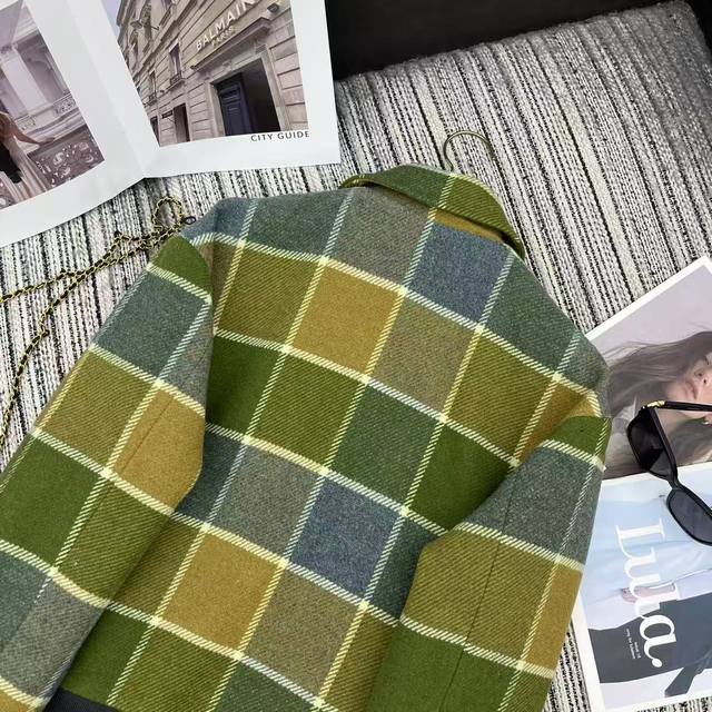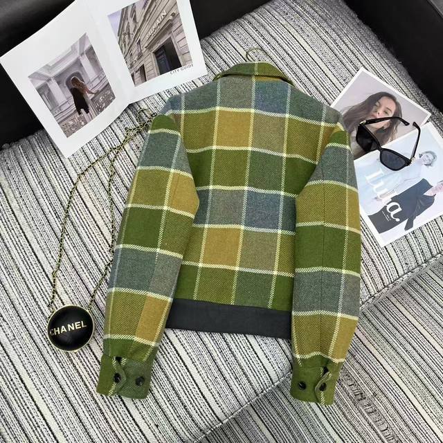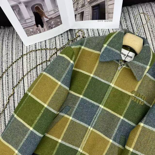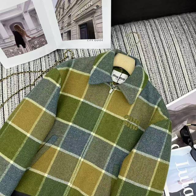 Highly recommend Miu Mi* 2025 Autumn/Winter New Color-Blocked Plaid Short Jacket | Exclusive YB Development! Top-Tier High-Quality Production! The retro yellow-green plaid outlines a relaxed and casual girlish style. The wool blend fabric combines a soft and supple texture, while the clean, short cut with a lapel and zipper design cleverly blends preppy style with modern flair. The color-blocked plaid texture contrasts with the brand logo embroidery, showcasing Miu Mi's signature sweet and cool style in the details. Pair it with the matching plaid skirt for an effortlessly chic autumn/winter look. Available now in sizes S, M, L, and DDD.