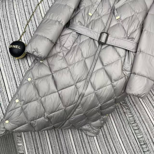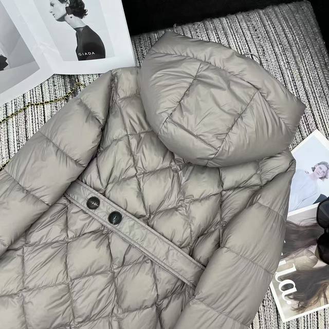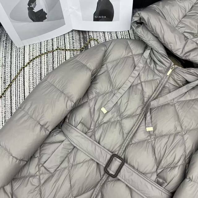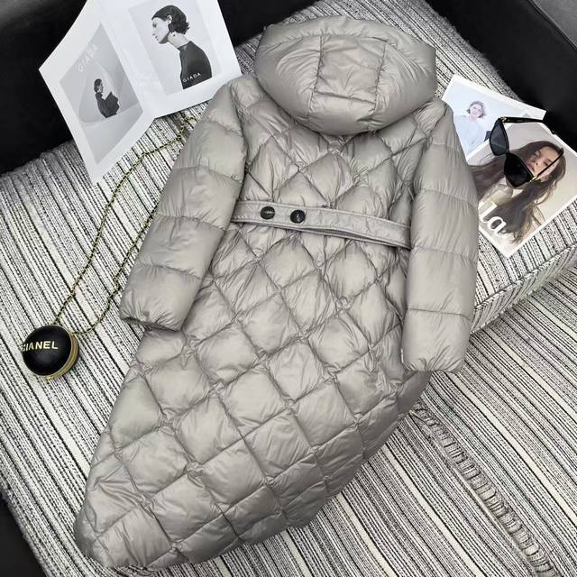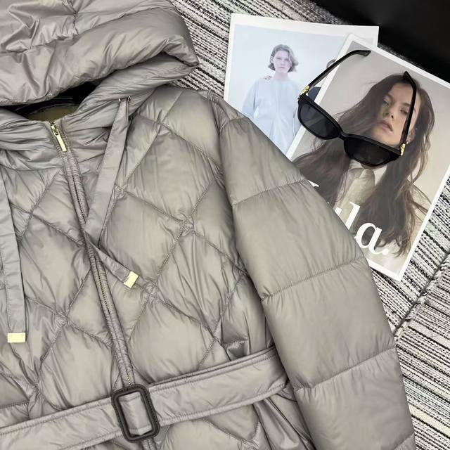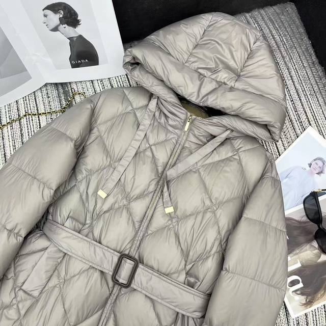 Highly recommend the 2025 early autumn/winter Max* new hooded plaid long down jacket with metal buckle trim, belted waist, lightweight and full 90% white goose down filling, high-end quality. Yb 1:1 custom two colors, 3 sizes.