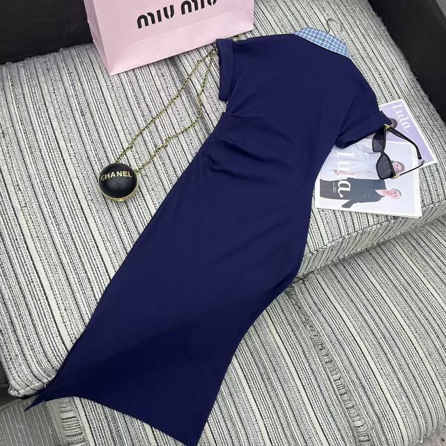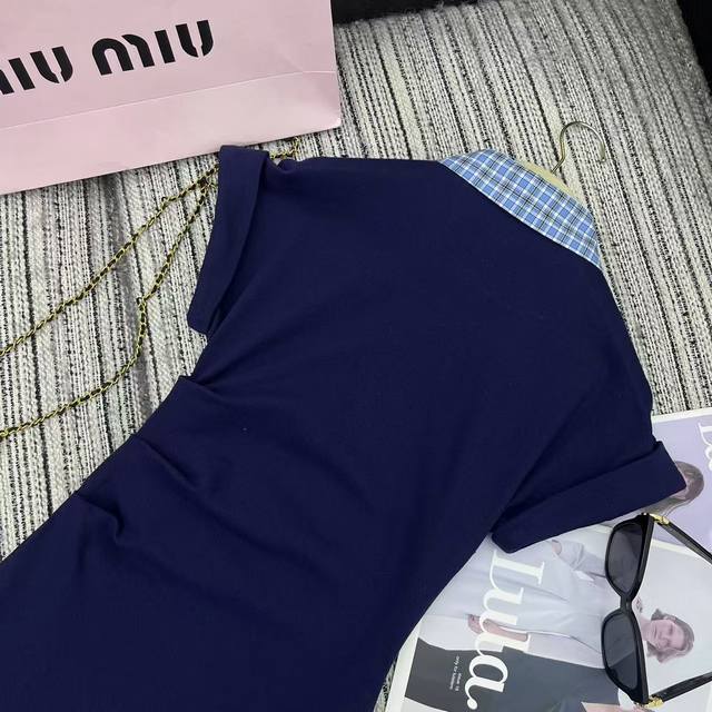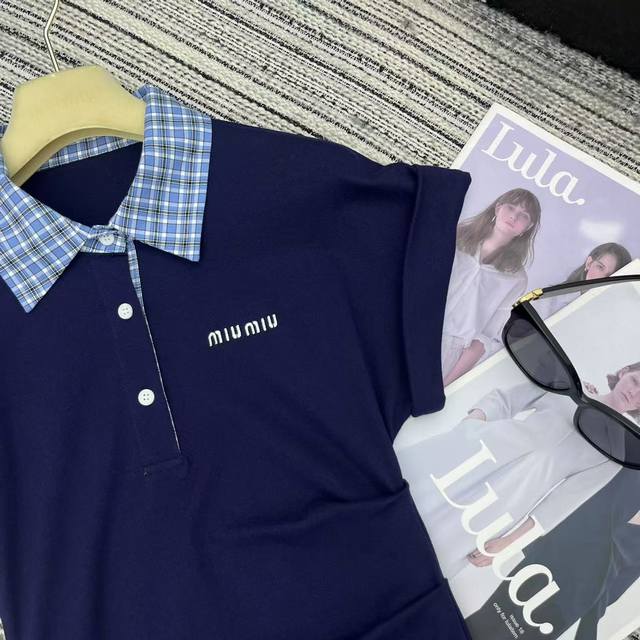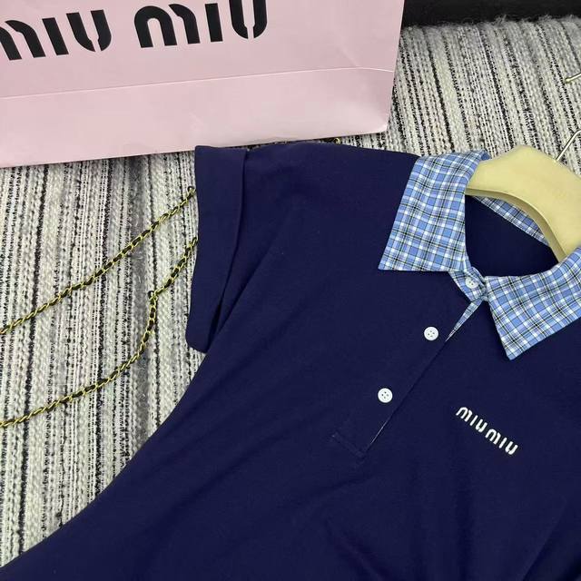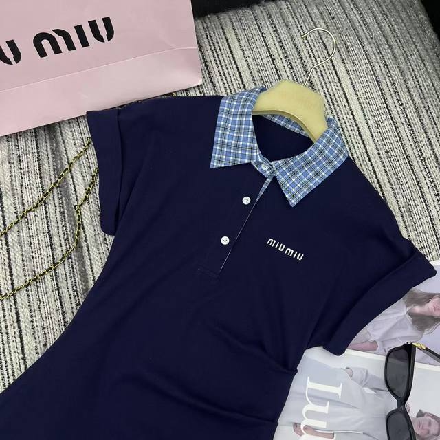 Highly recommended 25th year early spring and summer series Miu* new plaid lapel short-sleeved dress with pleated waist design embroidered letters embellished with two colors Sml running volume.